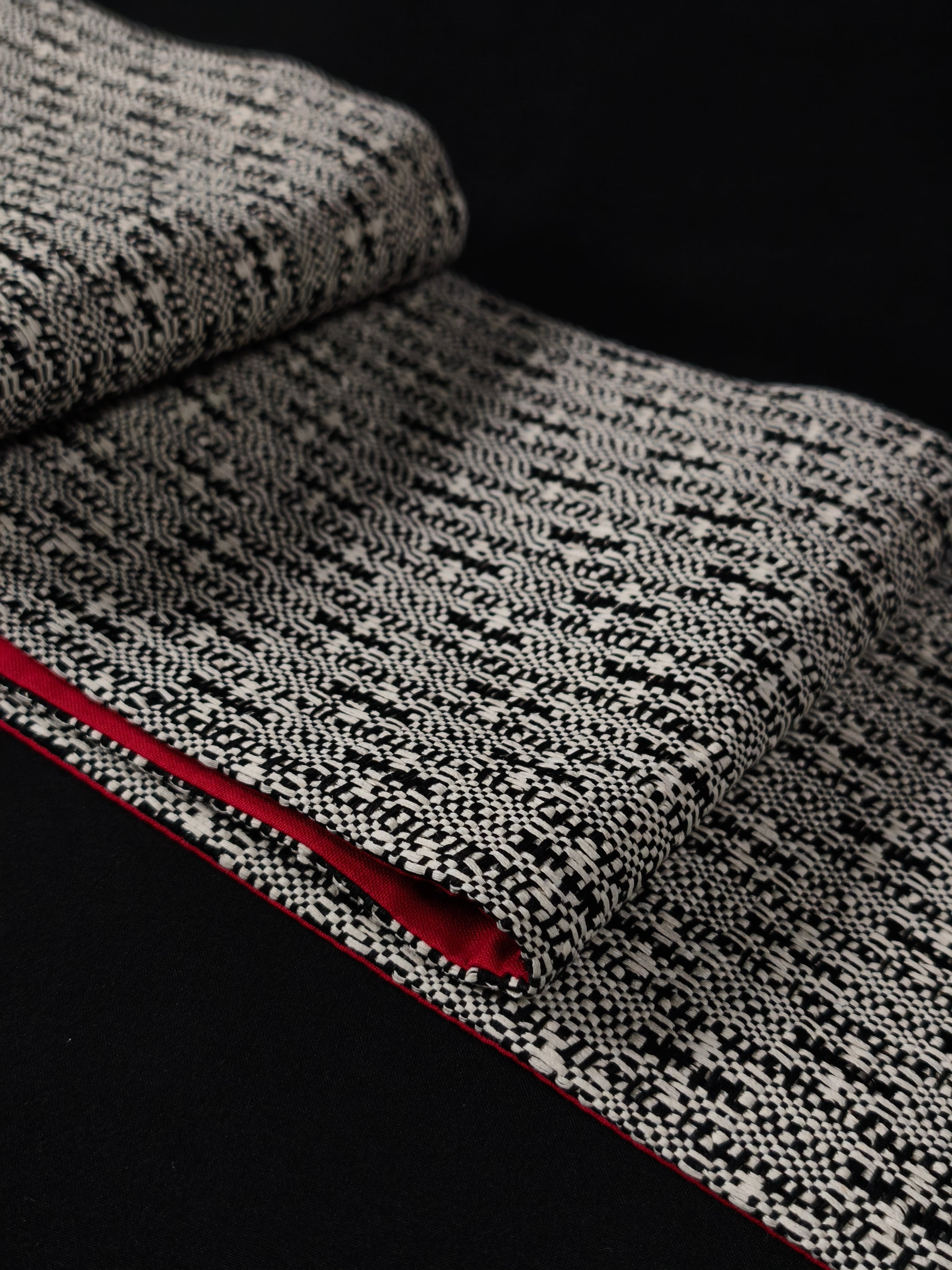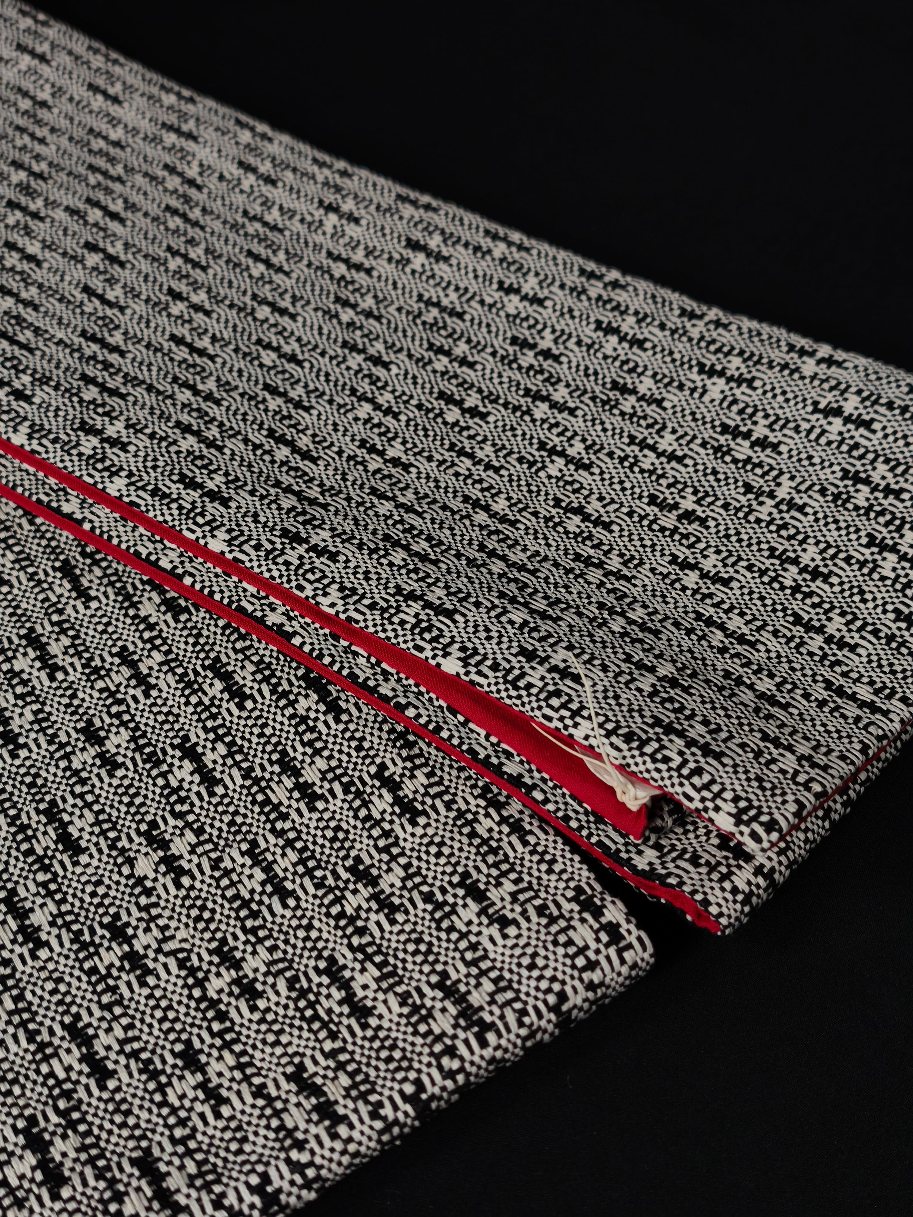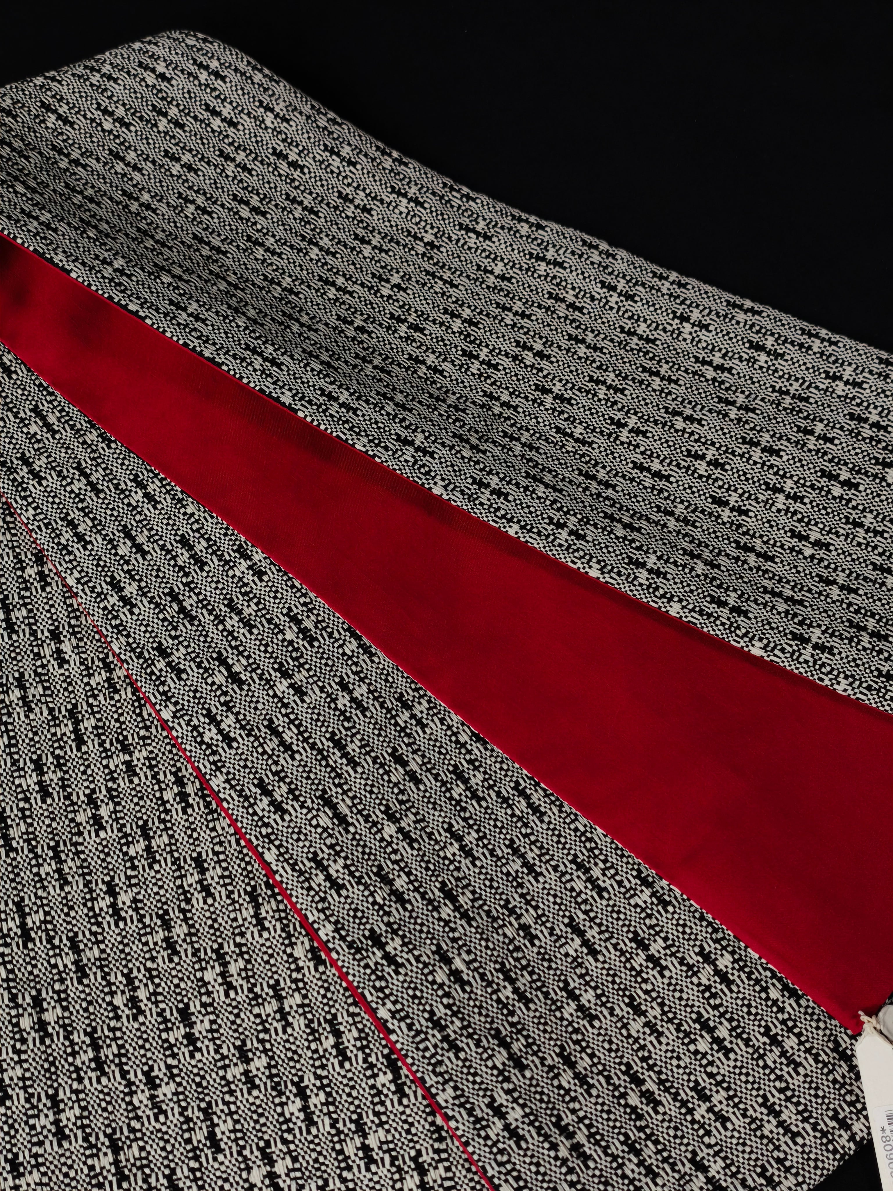 表は絹糸を束ねた糸で、色と黒の変わり格子に織られ、裏は緋色の綿生地が合わせられています。