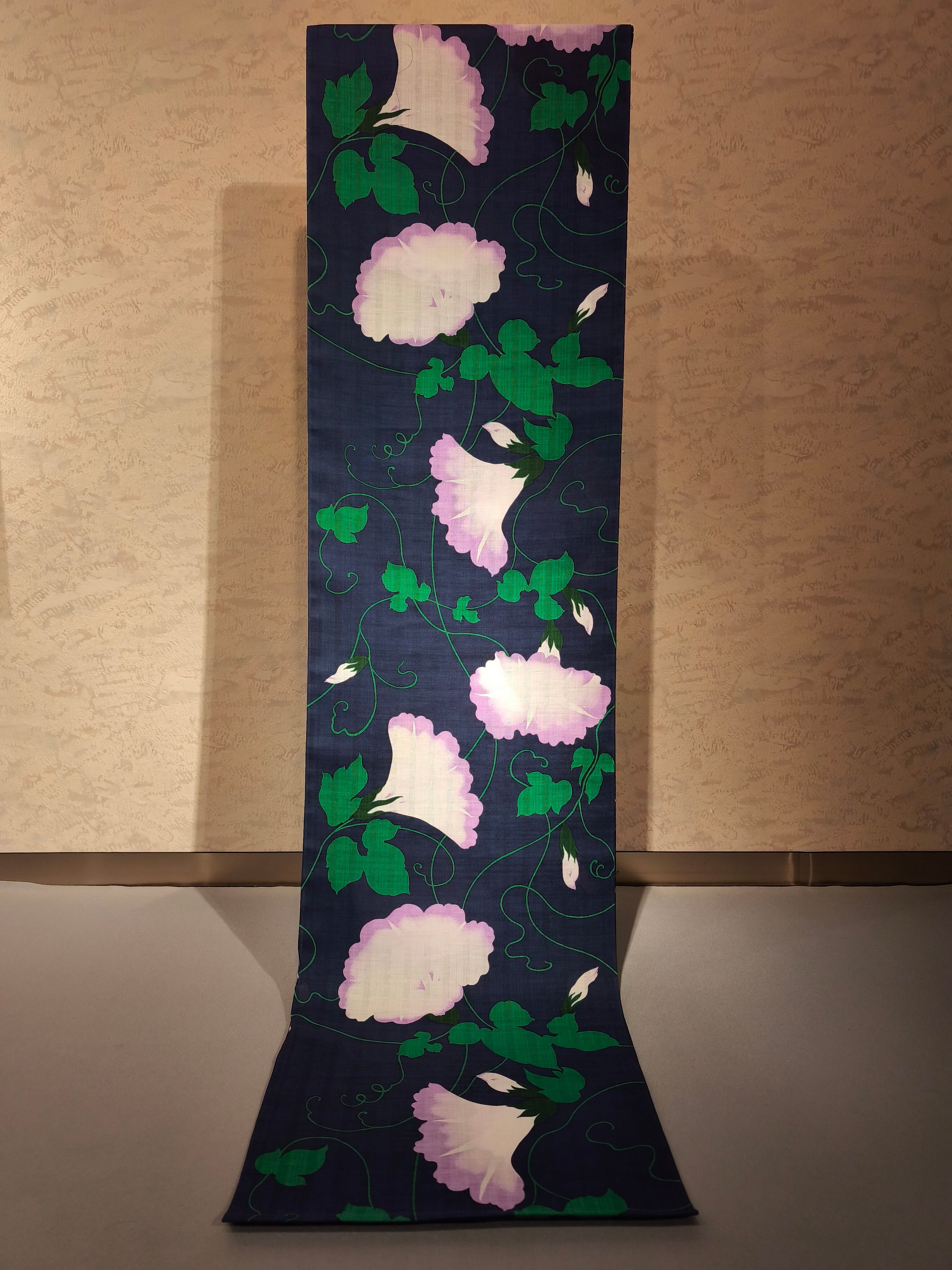 紺だ屋源兵衛の浴衣の中では、比較的オーソドックスな朝顔の柄ですが、