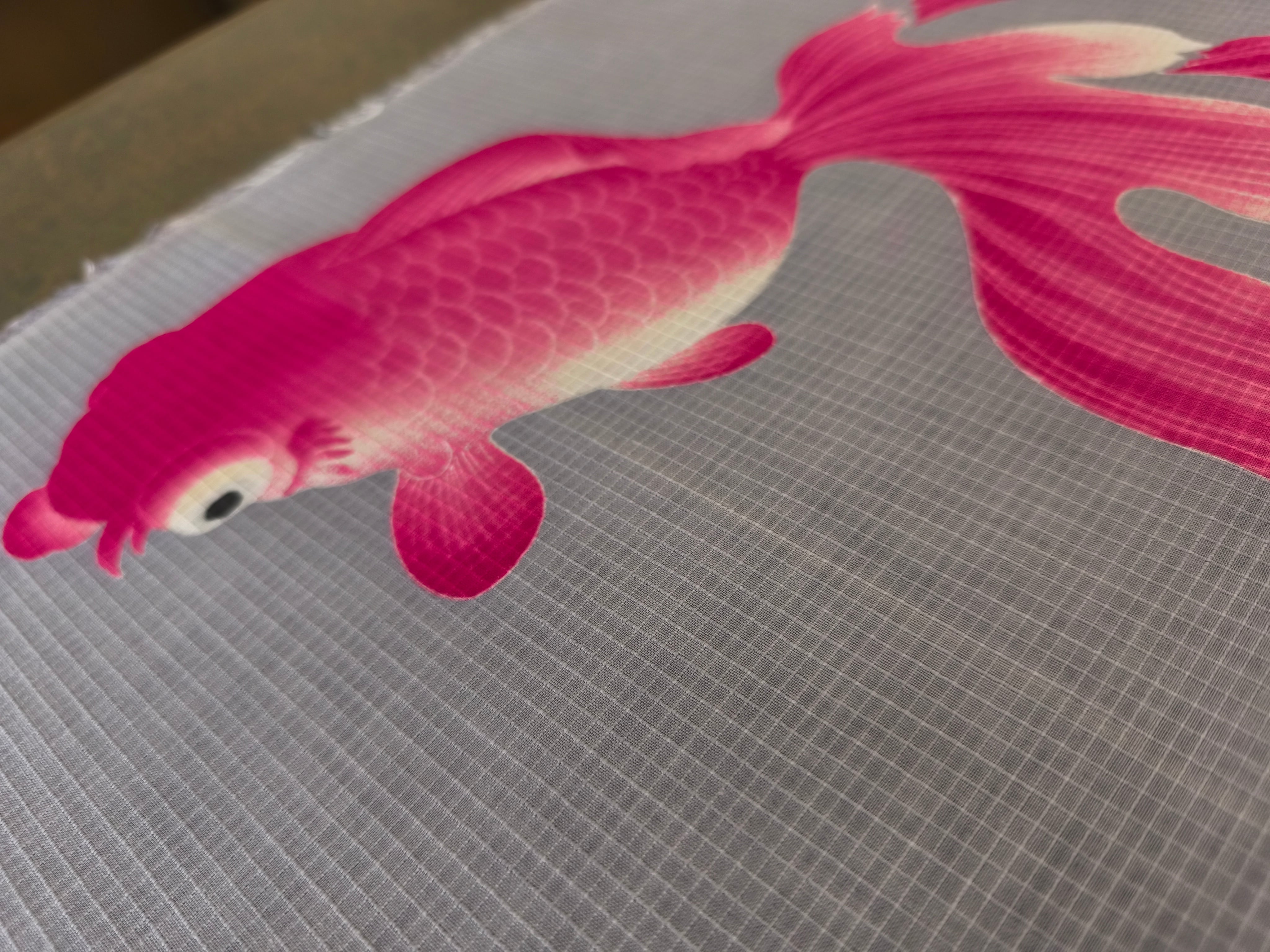 淡いグレーの地色に、ピンクで大胆に染められた金魚が大人カワイイ浴衣地になっています。