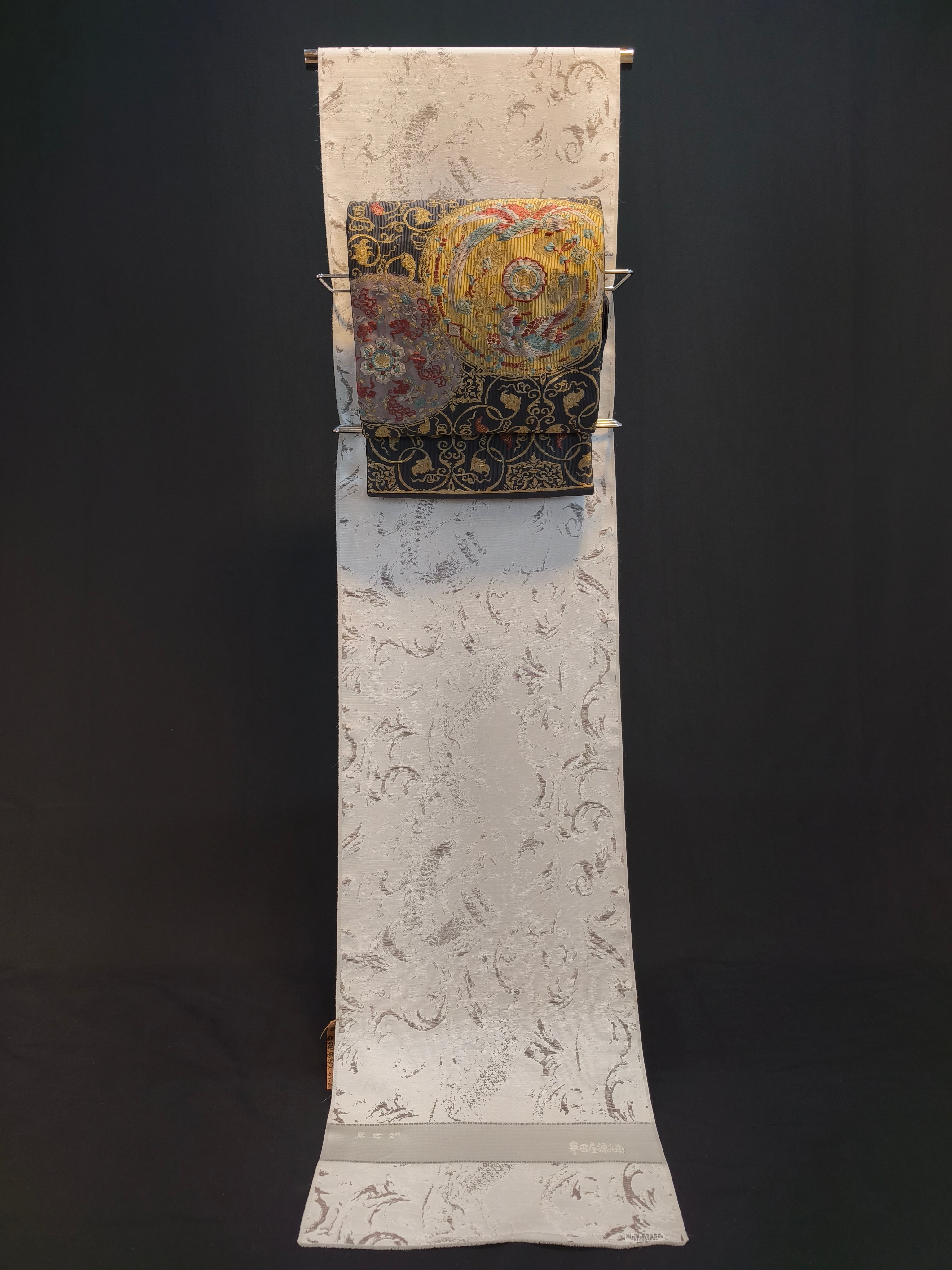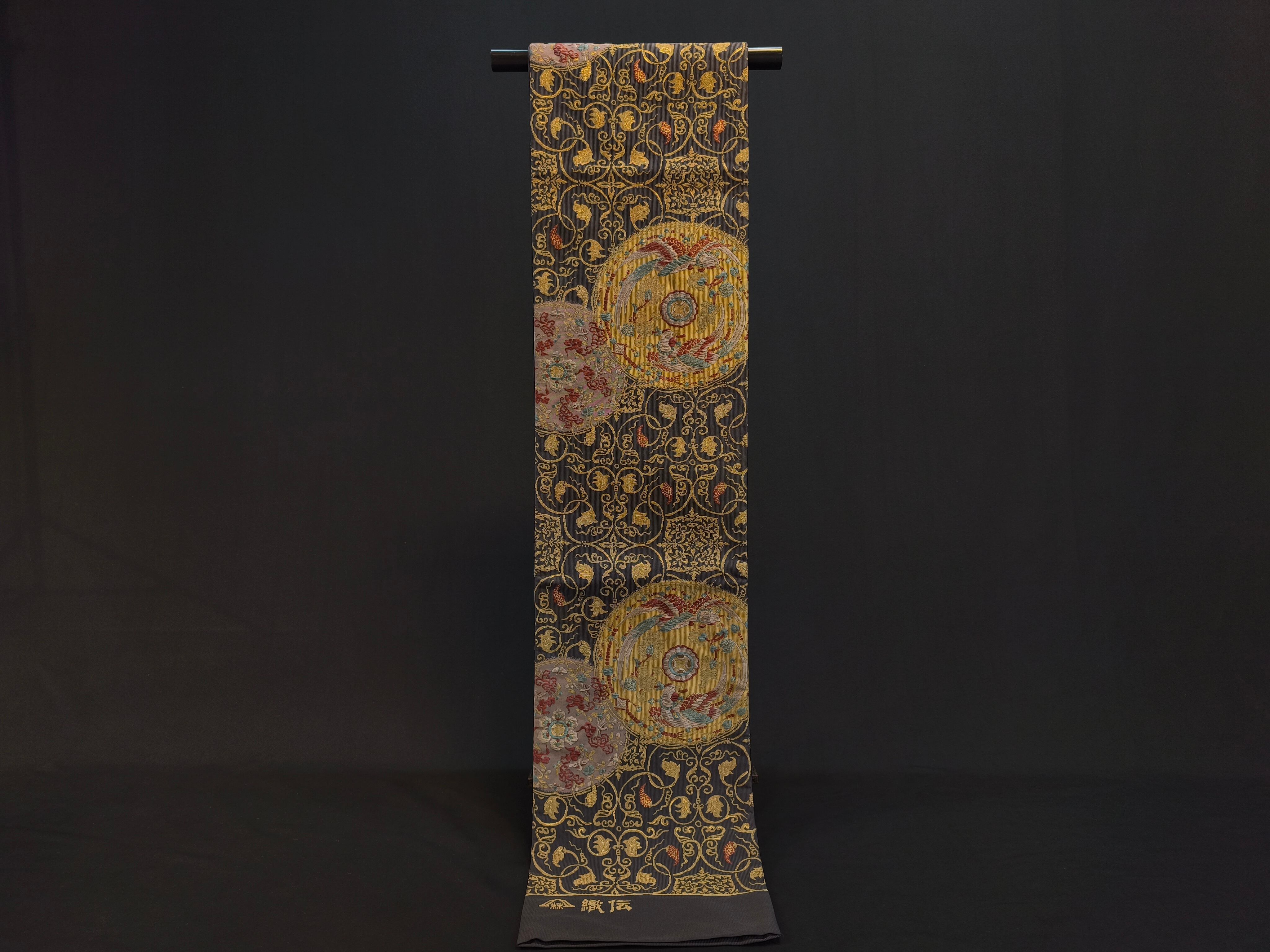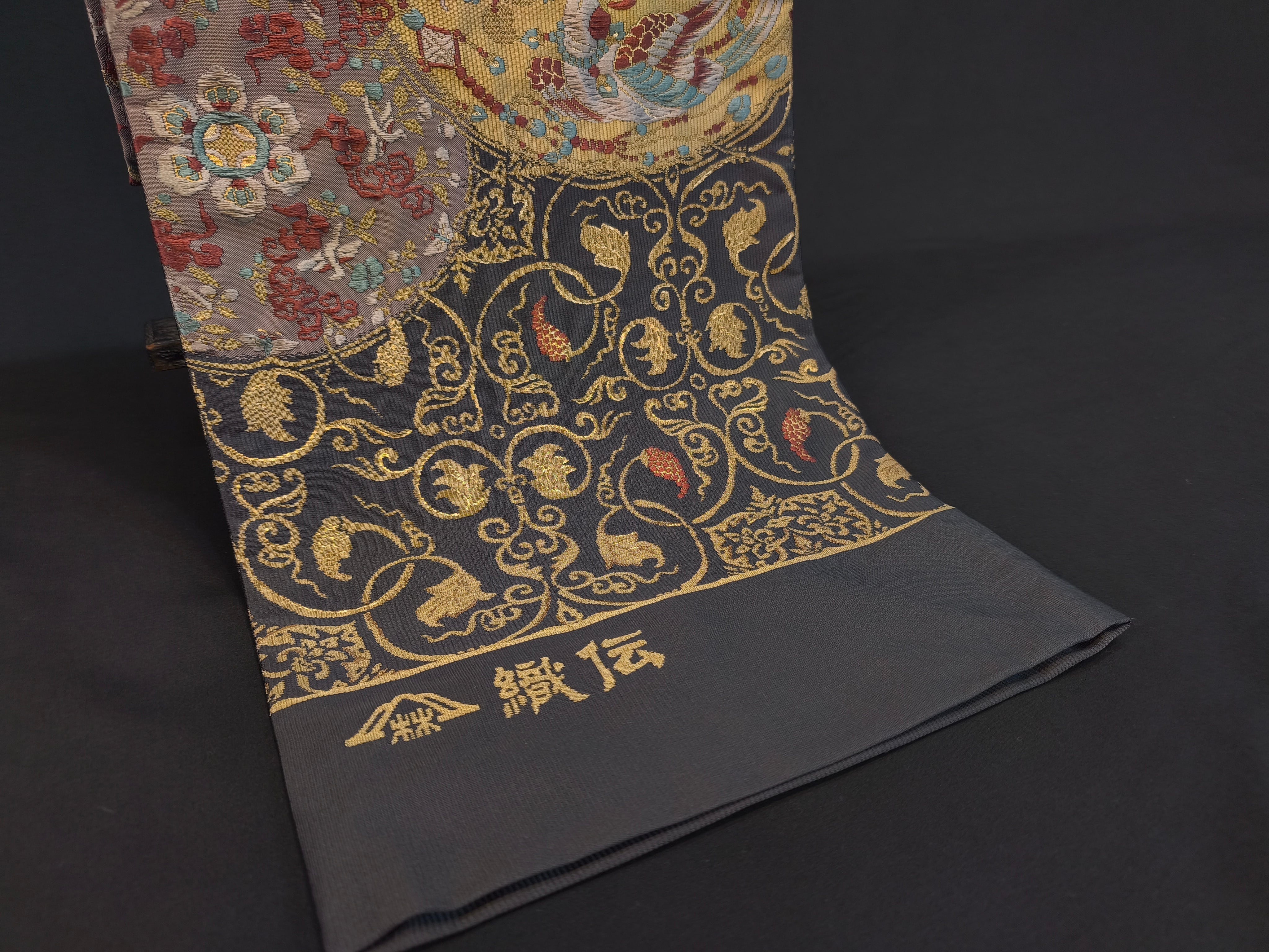 濃いチャコールグレー地に、少し金糸を混ぜた糸で唐草を表現した上に、鳳凰を配した鏡裏紋様を織りなし、非常に迫力がある帯に仕上がっております。