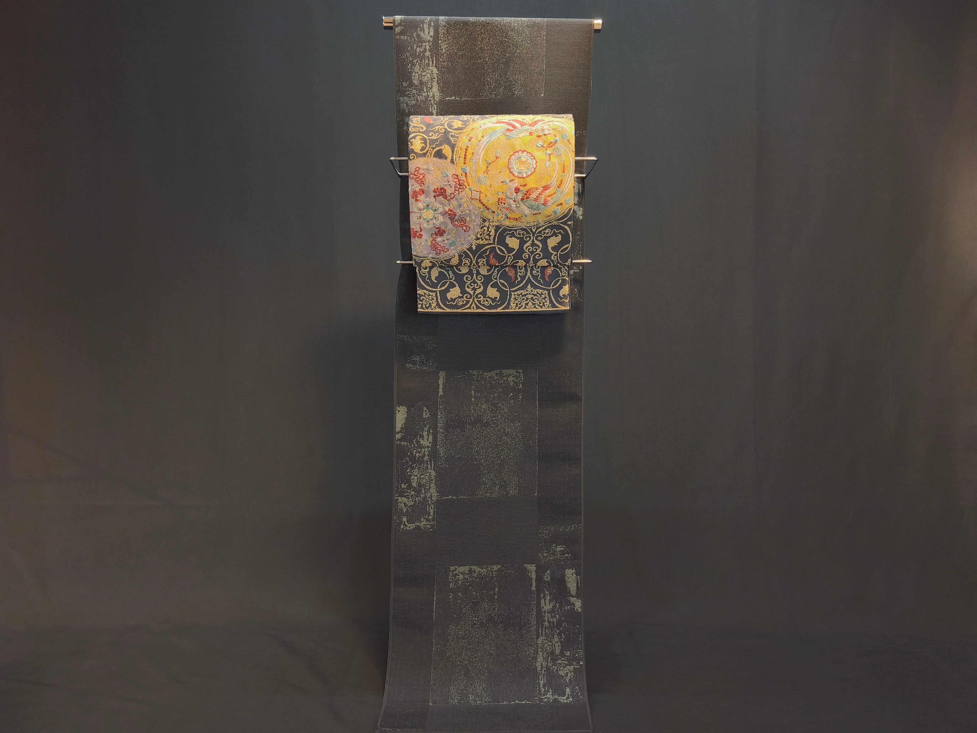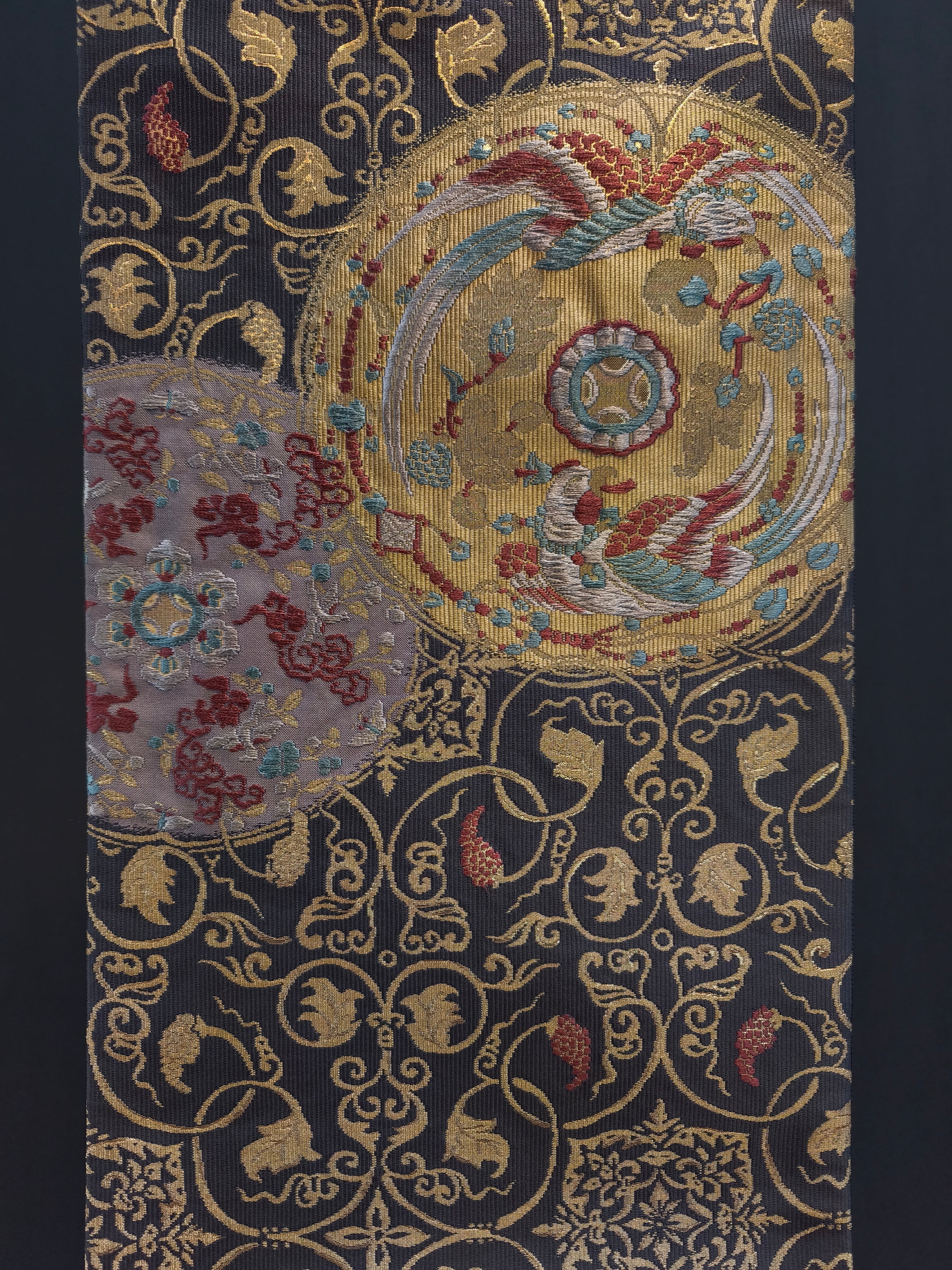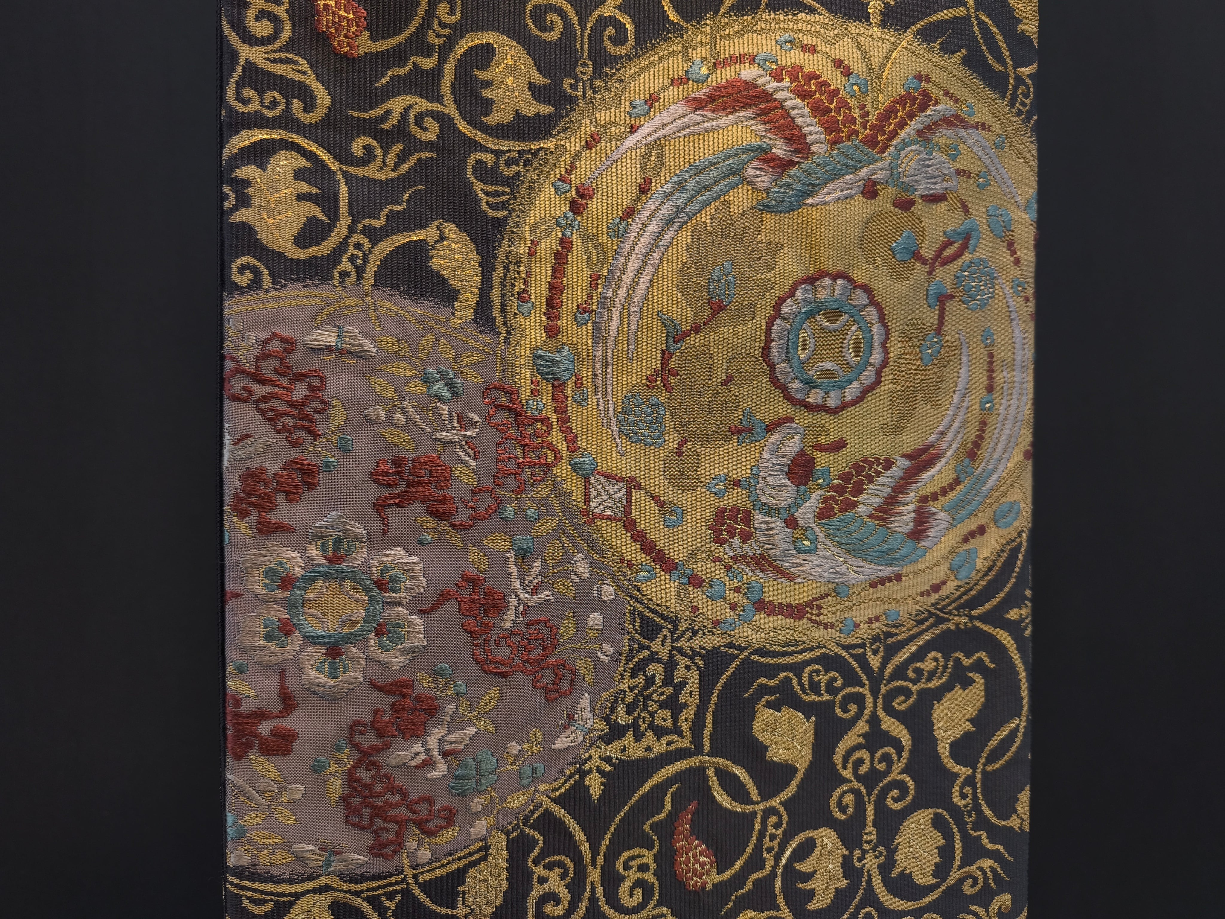 濃いチャコールグレー地に、少し金糸を混ぜた糸で唐草を表現した上に、鳳凰を配した鏡裏紋様を織りなし、非常に迫力がある帯に仕上がっております。