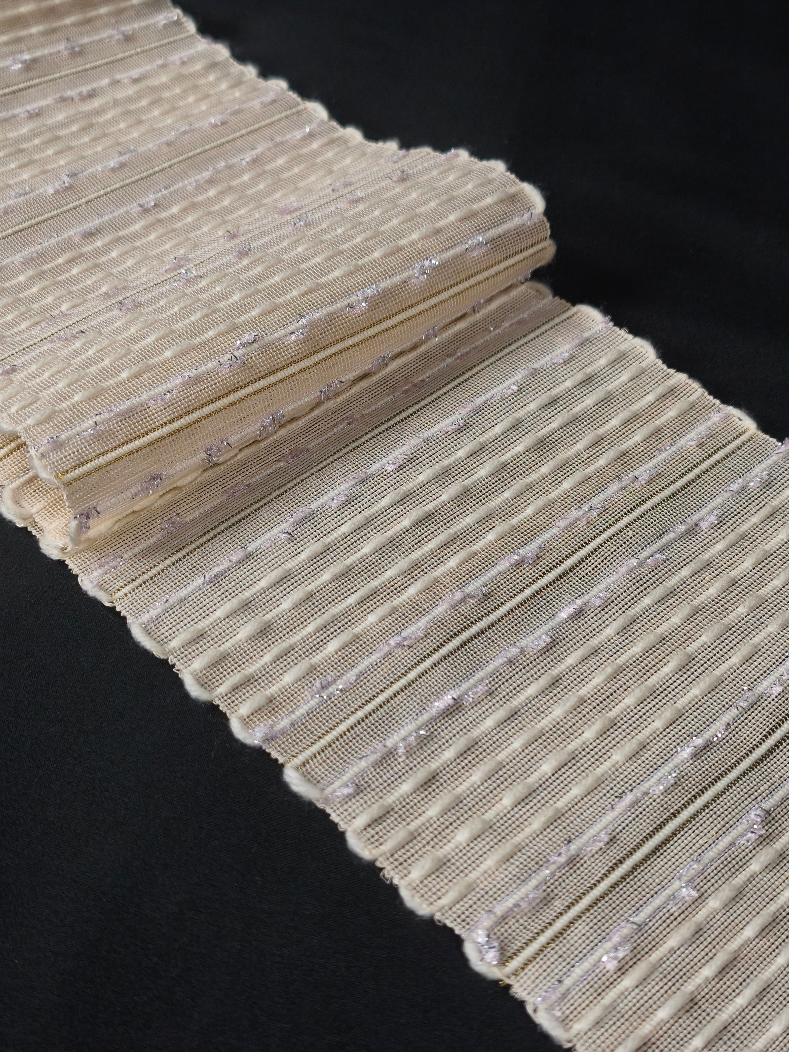 麻より硬い繊維の為ハリがあり、最初は少々硬さを感じますが、締め心地の良い帯です。