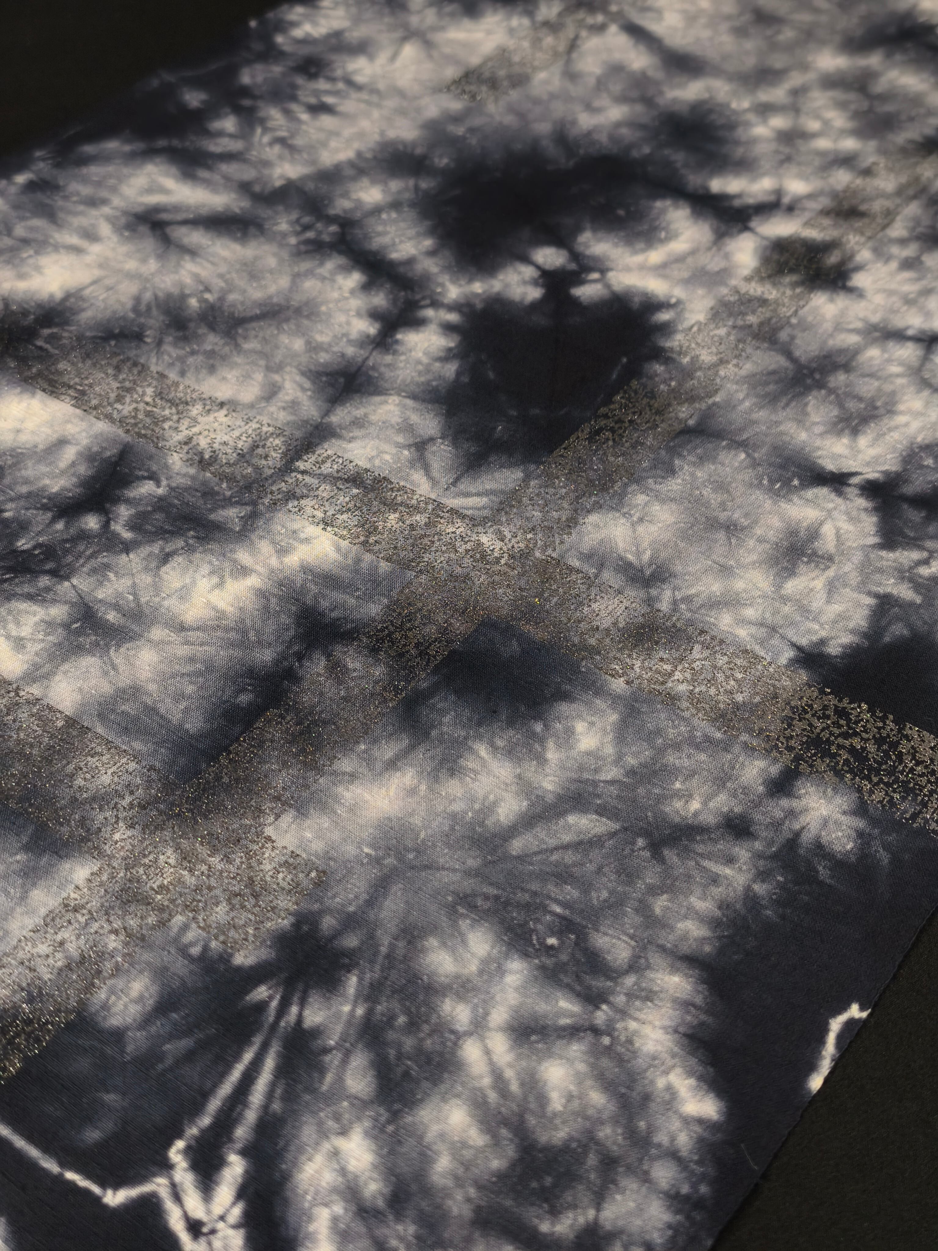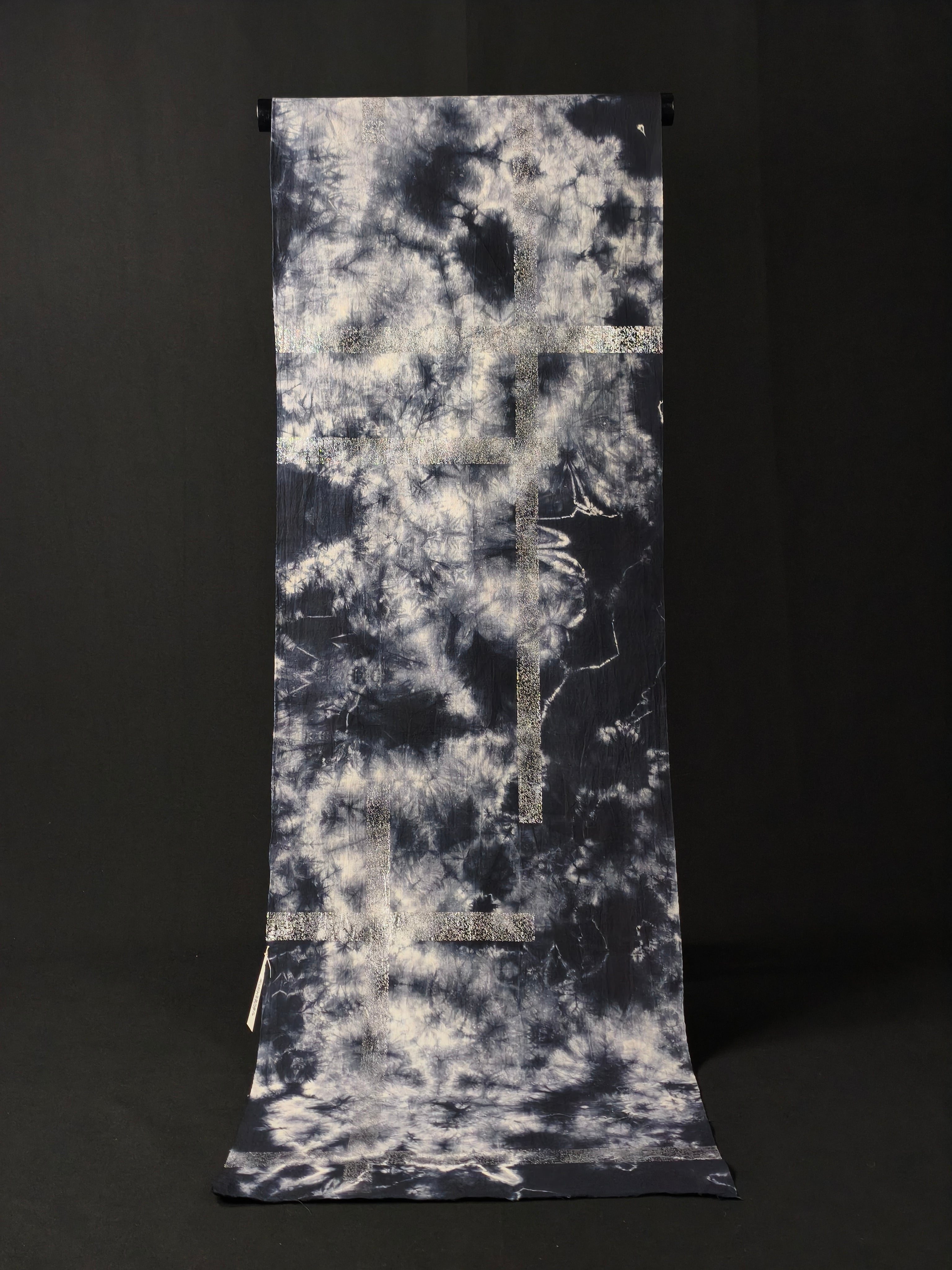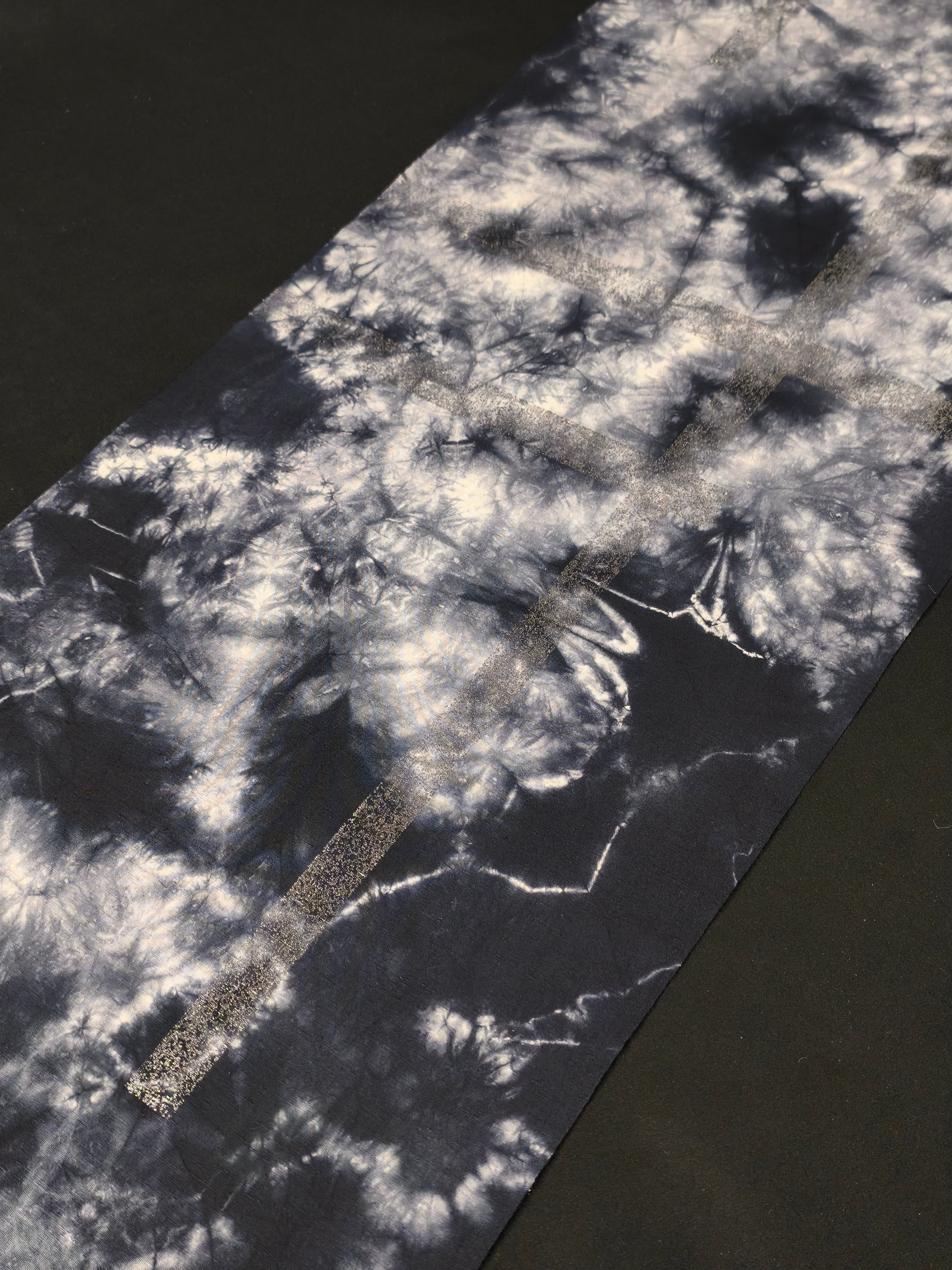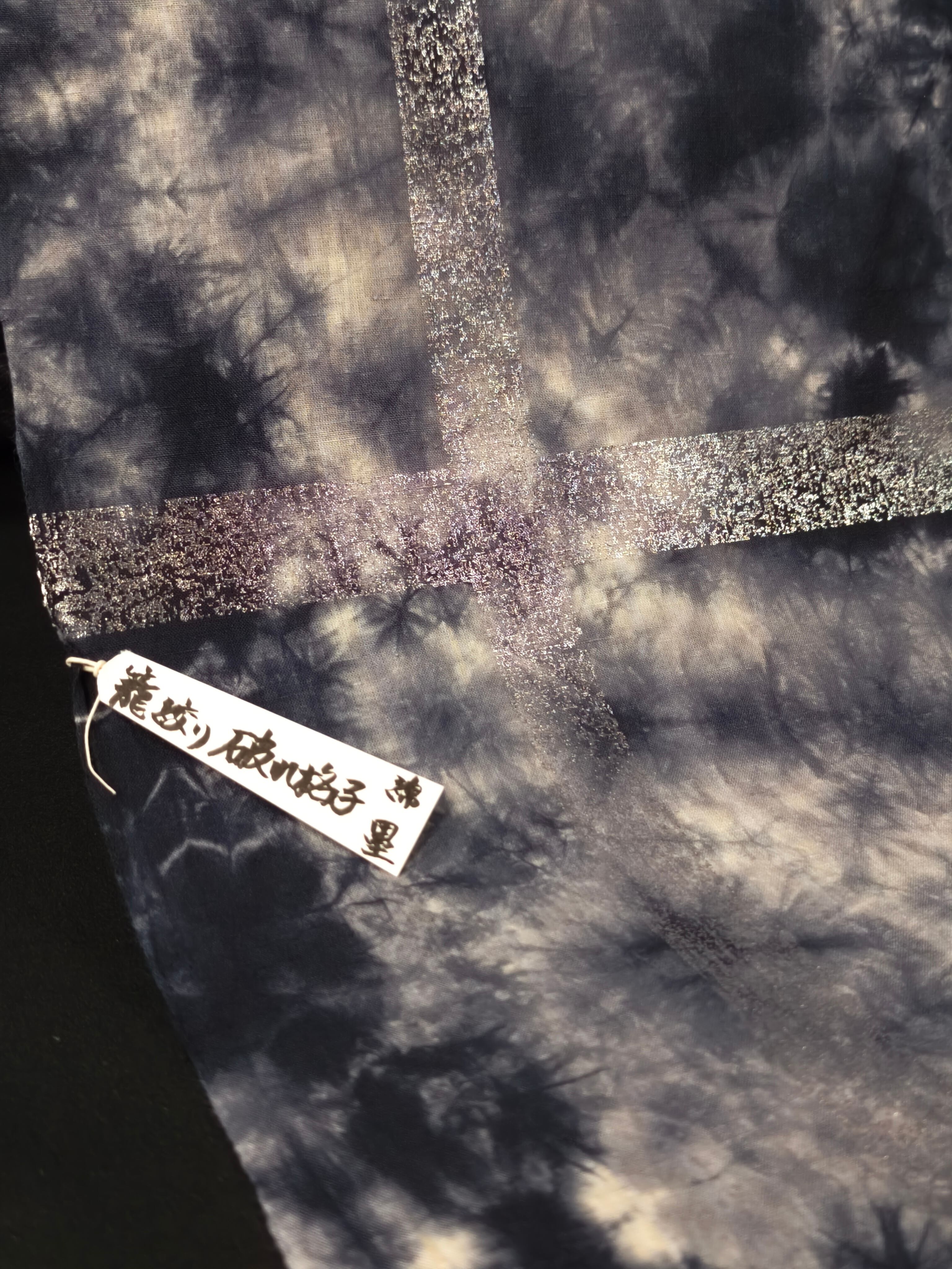 この浴衣は籠絞りをした後で、破れ格子の柄を銀箔で表現しています。