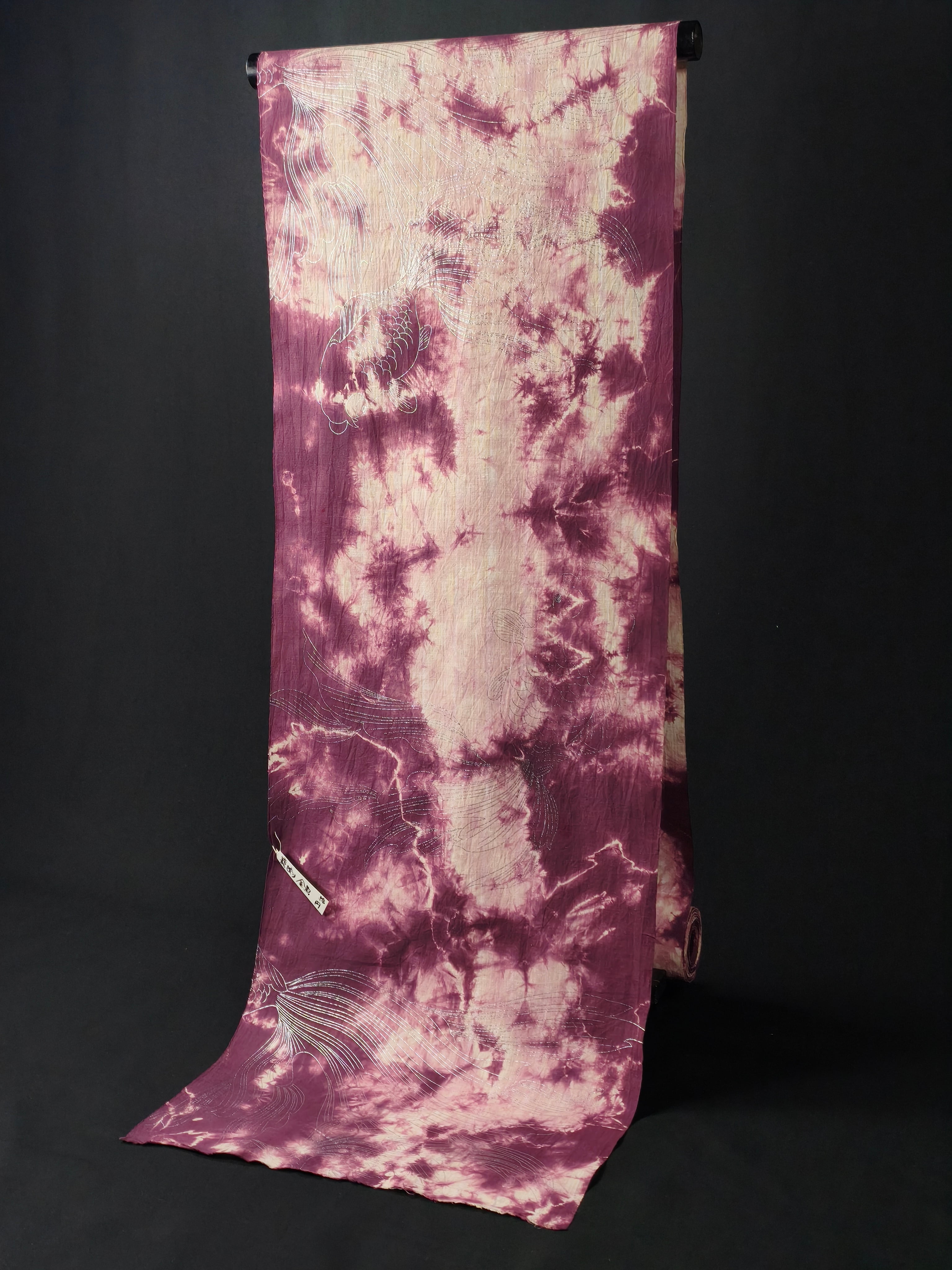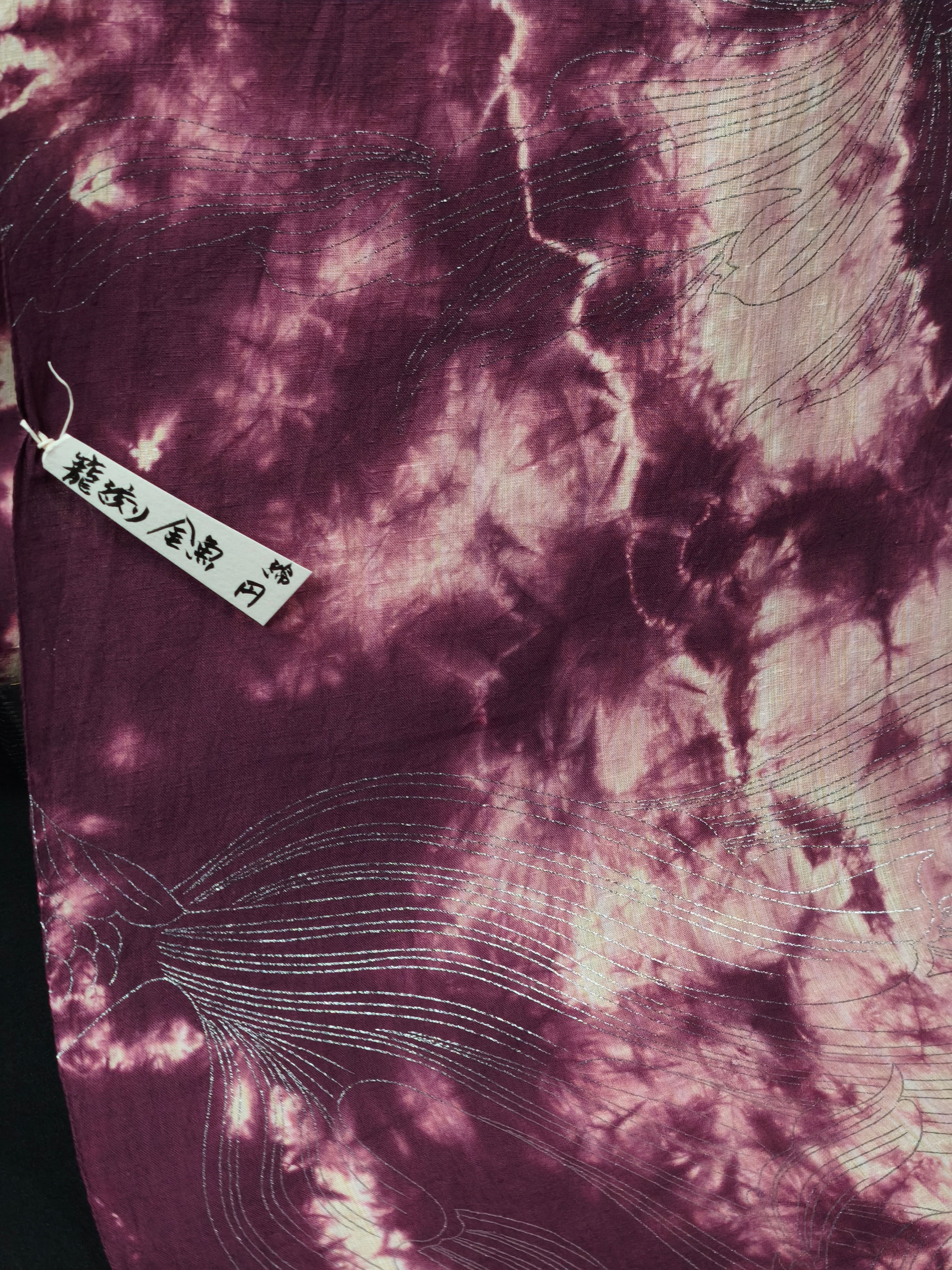 この浴衣は籠絞りをした後で、金魚の柄を銀箔で表現しています。