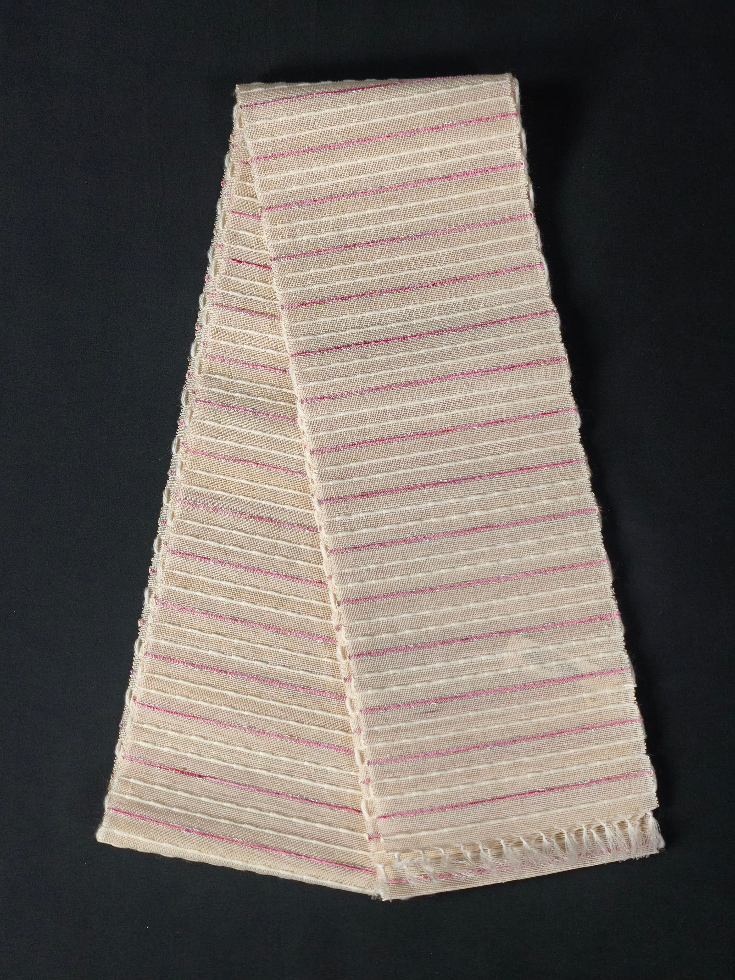 白地にピンクの太い色糸を織り込んであり、また金銀糸も同様に織り込まれているので、白地の清潔感の中に可愛らしさがある半巾帯です。