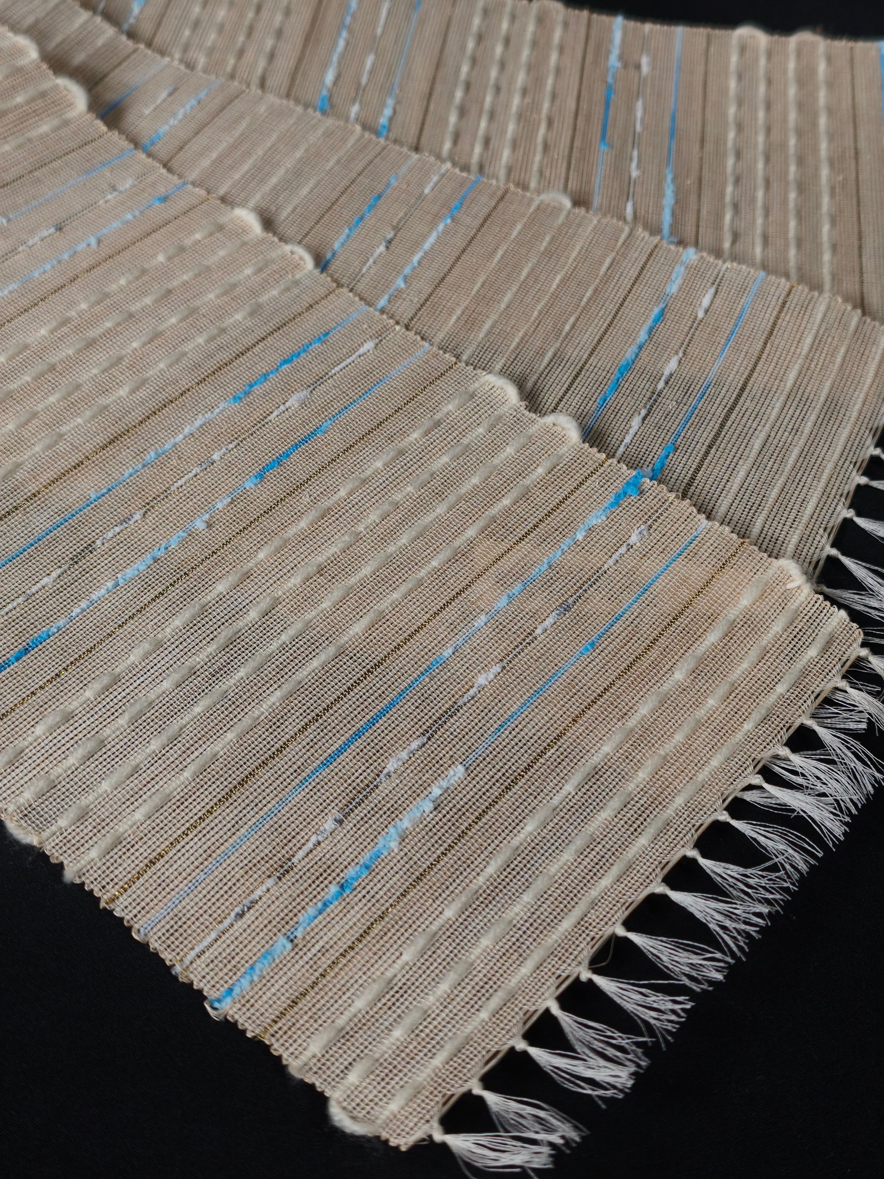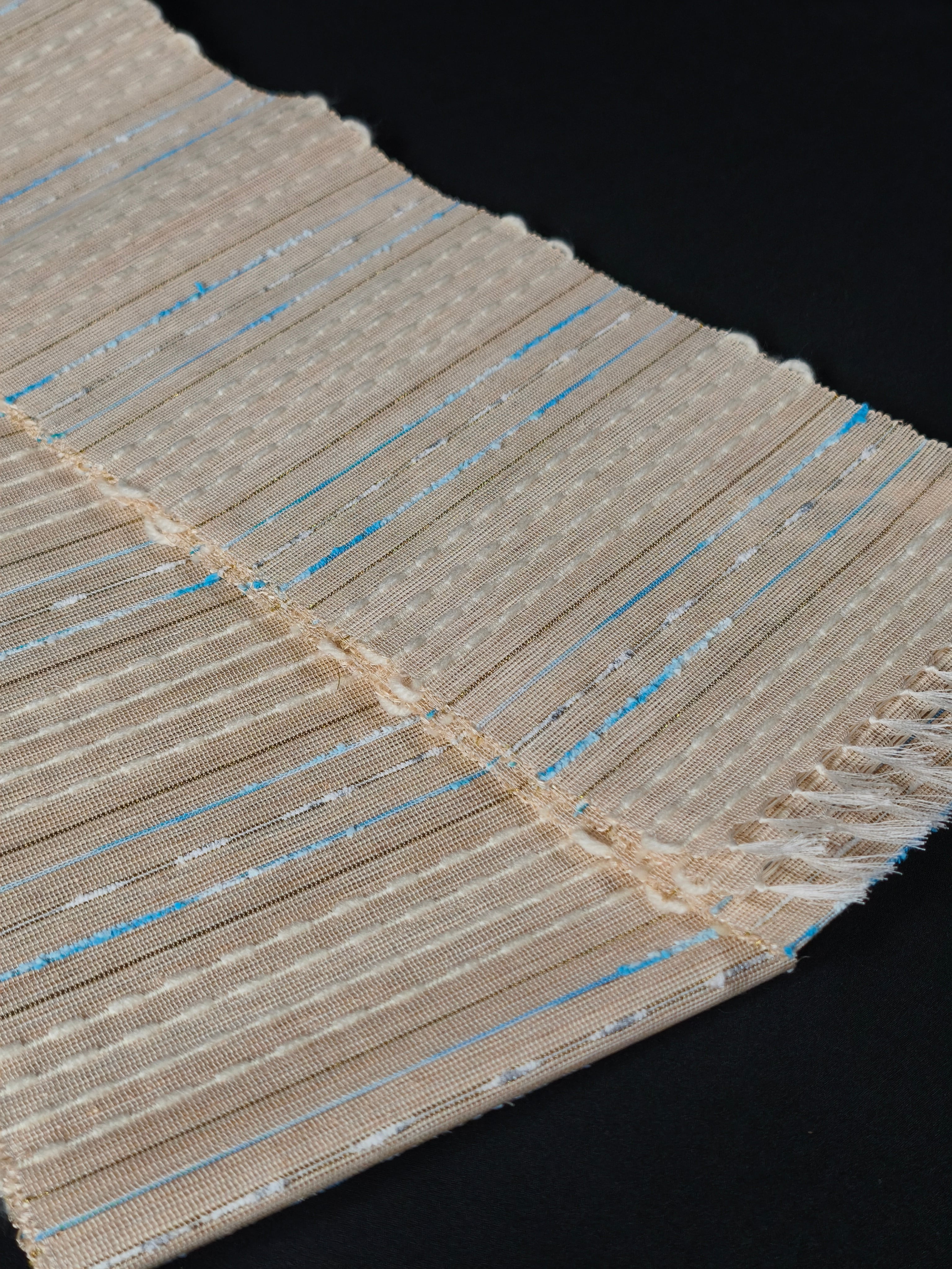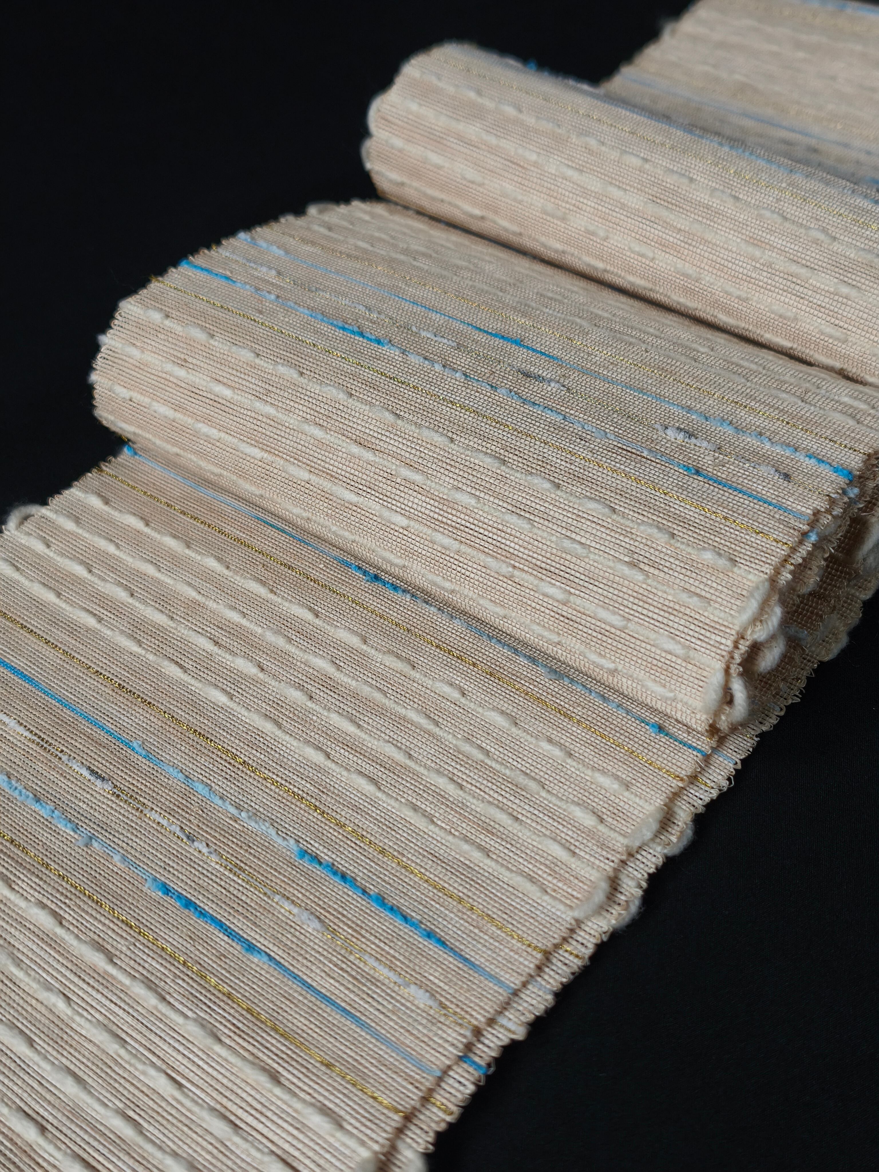 麻より硬い繊維の為ハリがあり、最初は少々硬さを感じますが、締め心地の良い帯です。