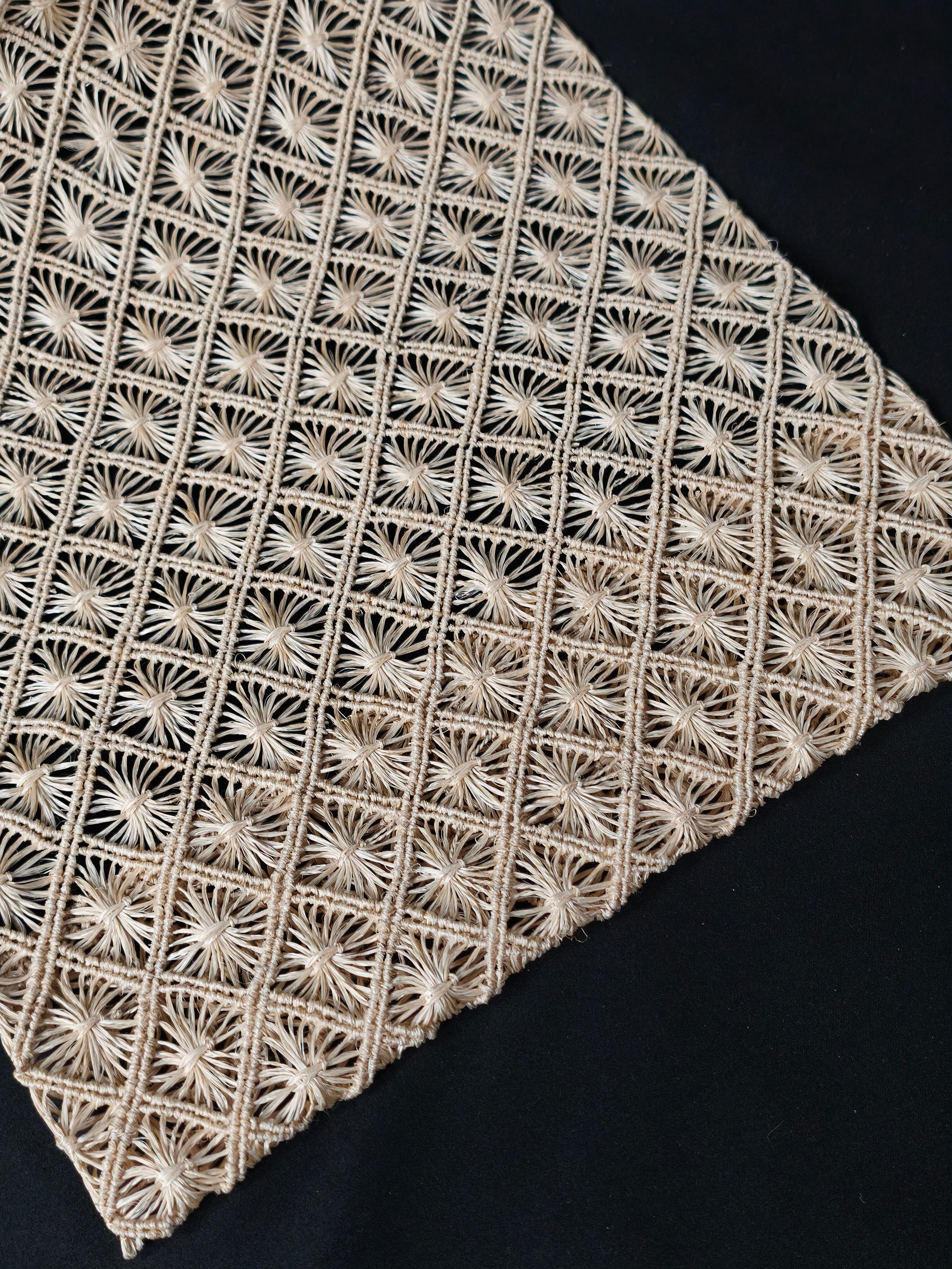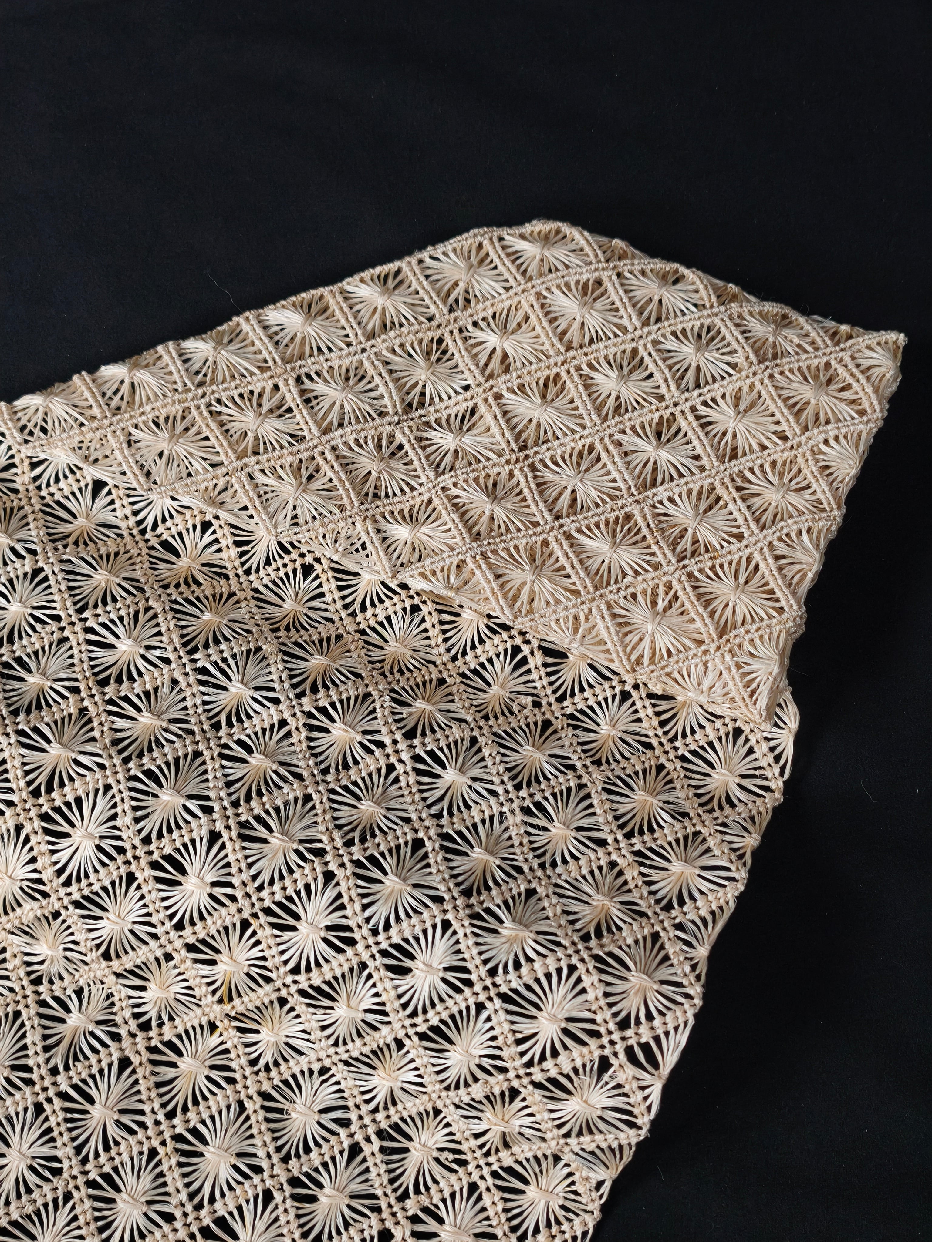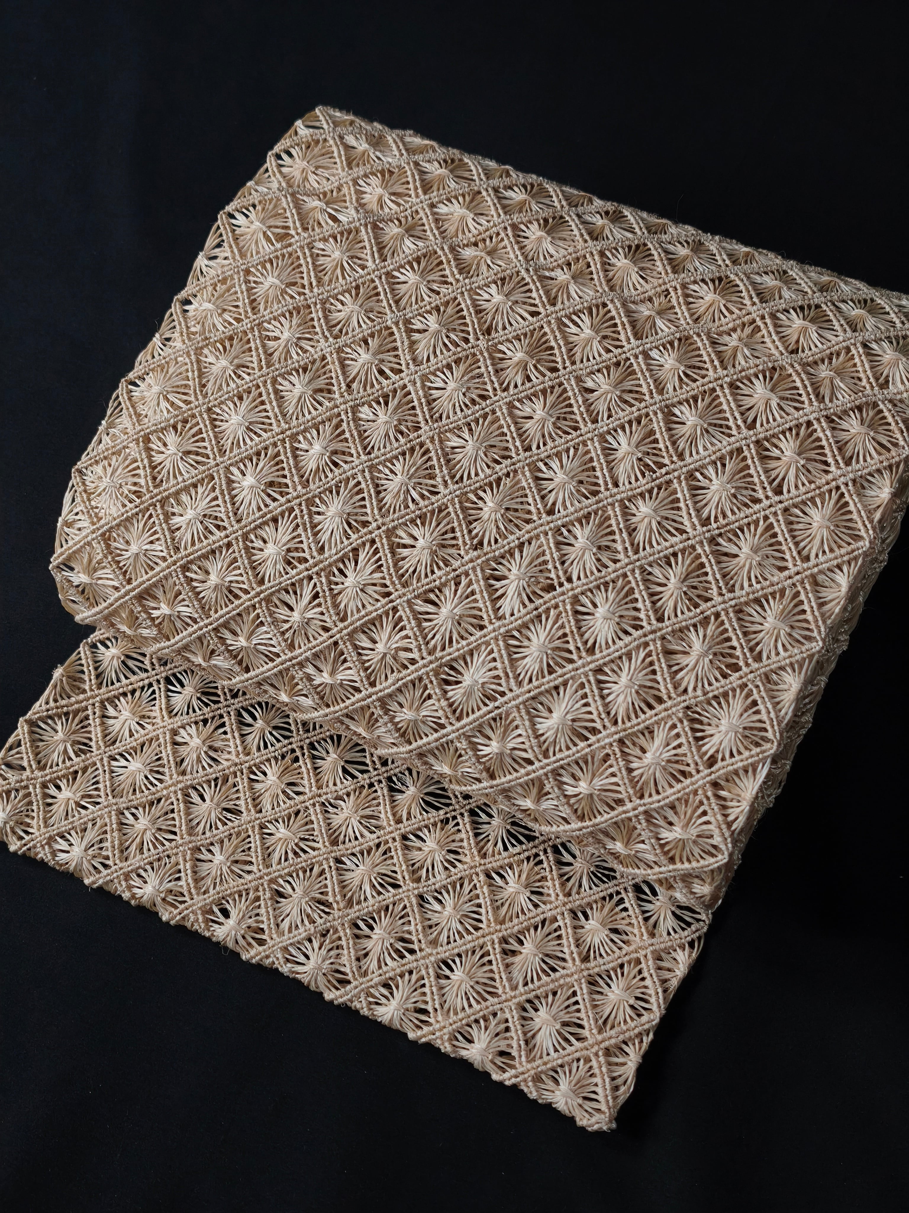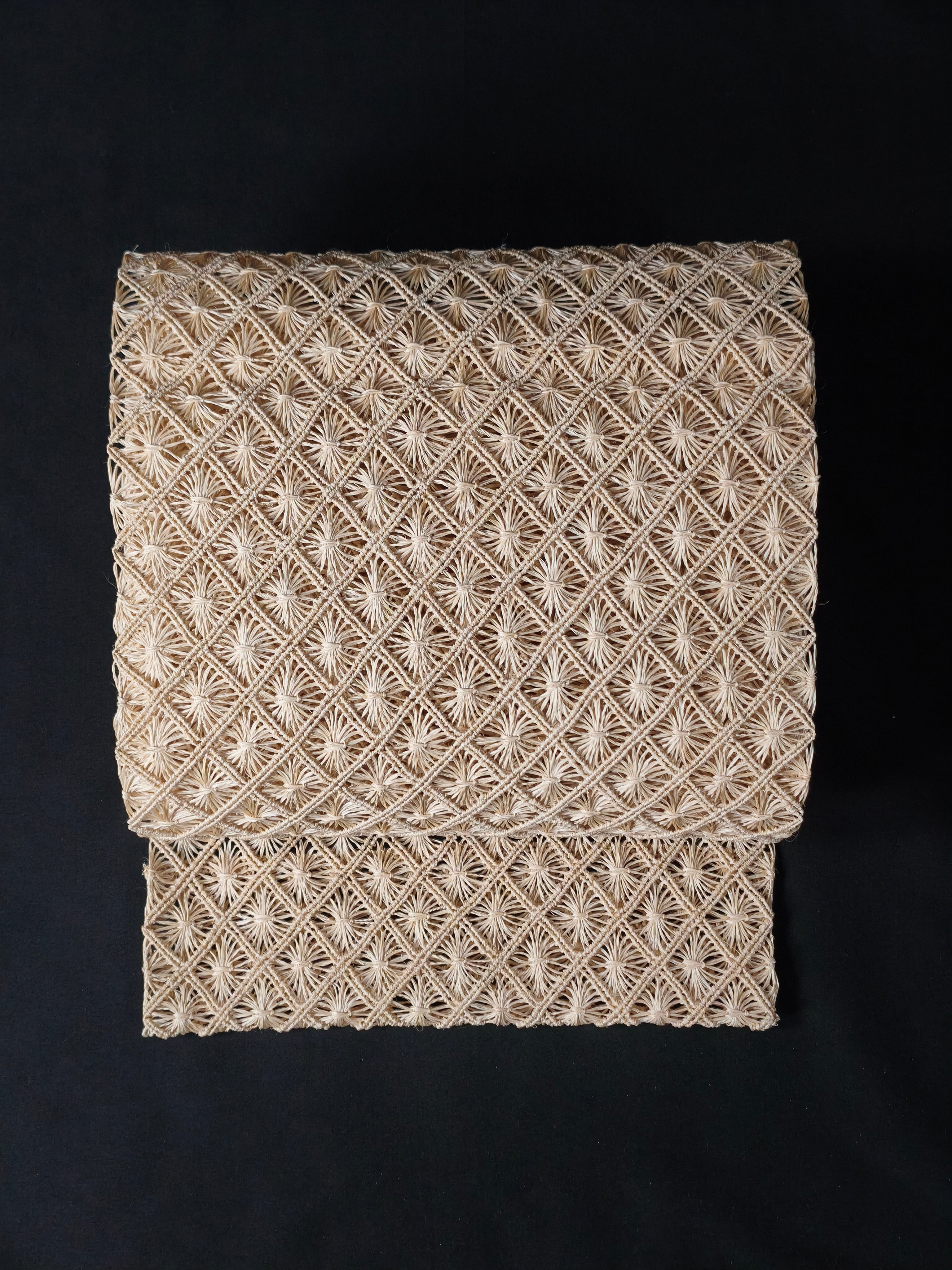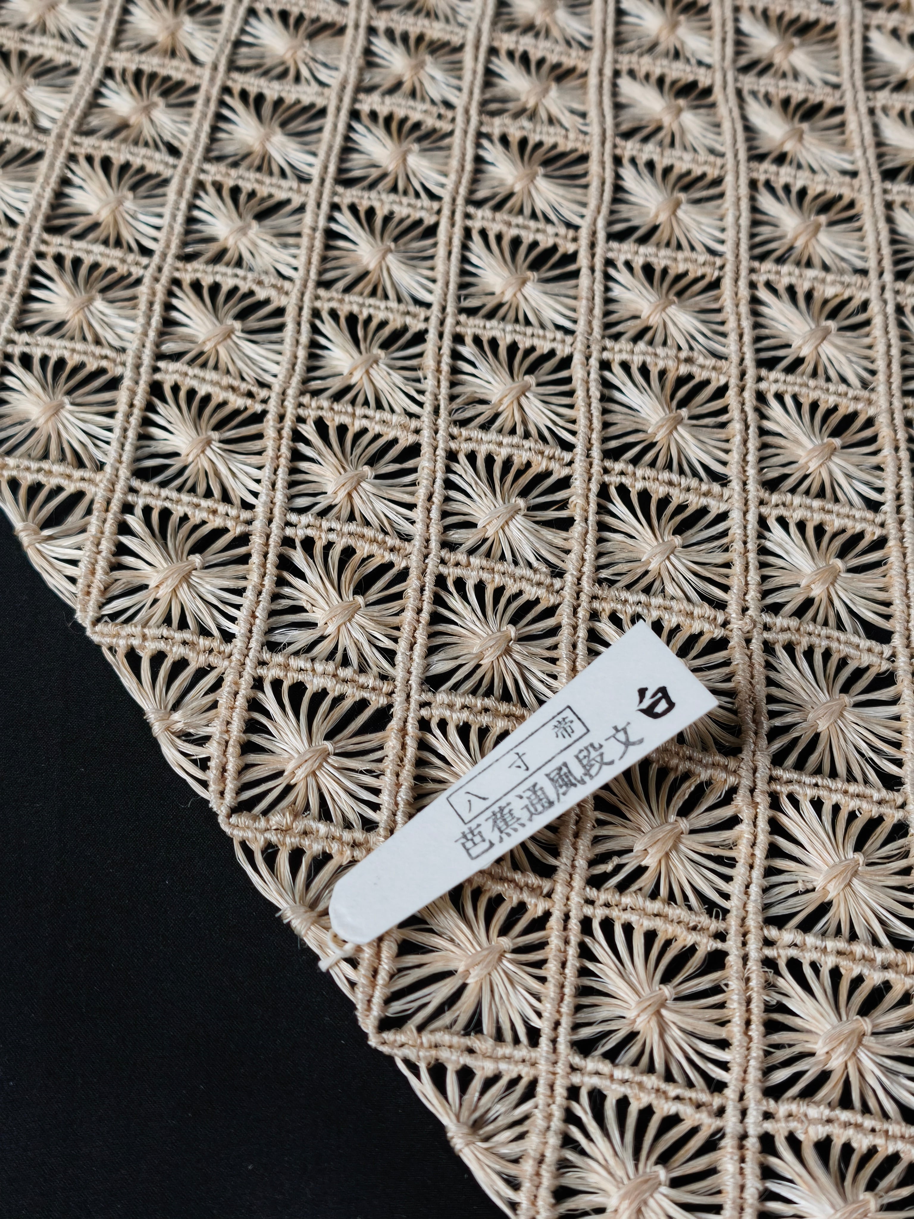 芭蕉科の多年草(糸芭蕉)の繊維で織られ、麻より硬い繊維の為ハリがあり、最初は少々硬さを感じますが、締め心地の良い帯です。