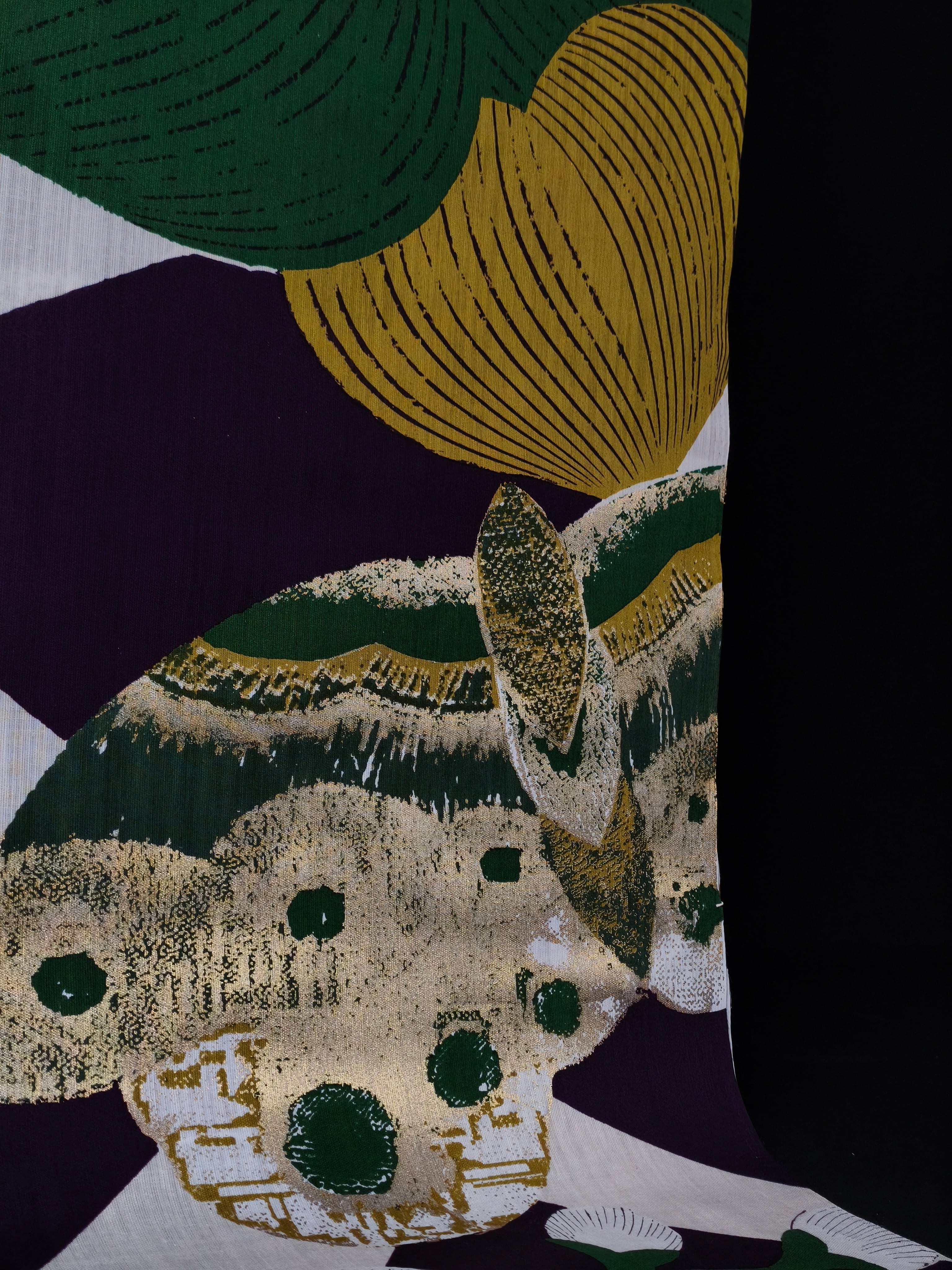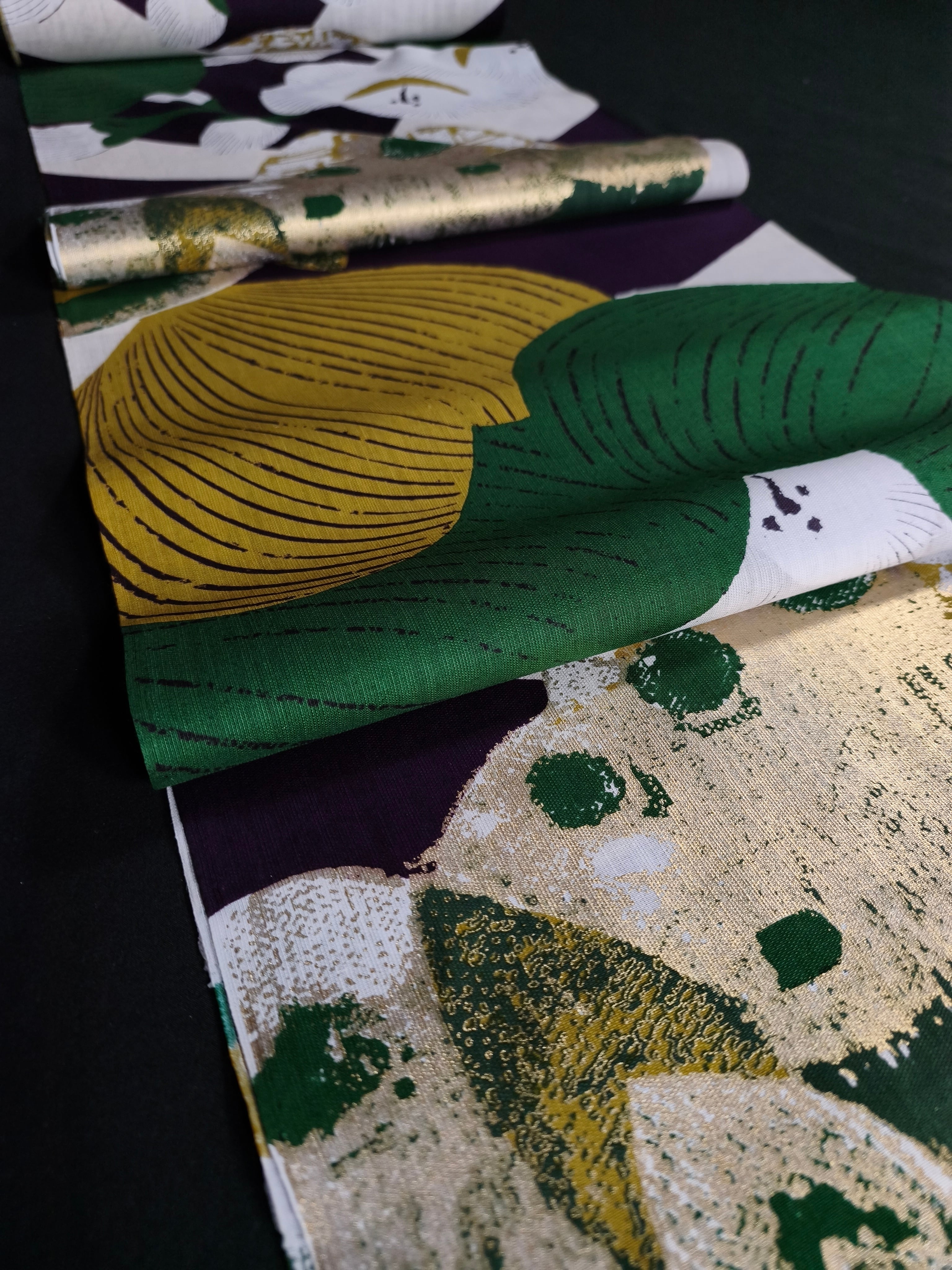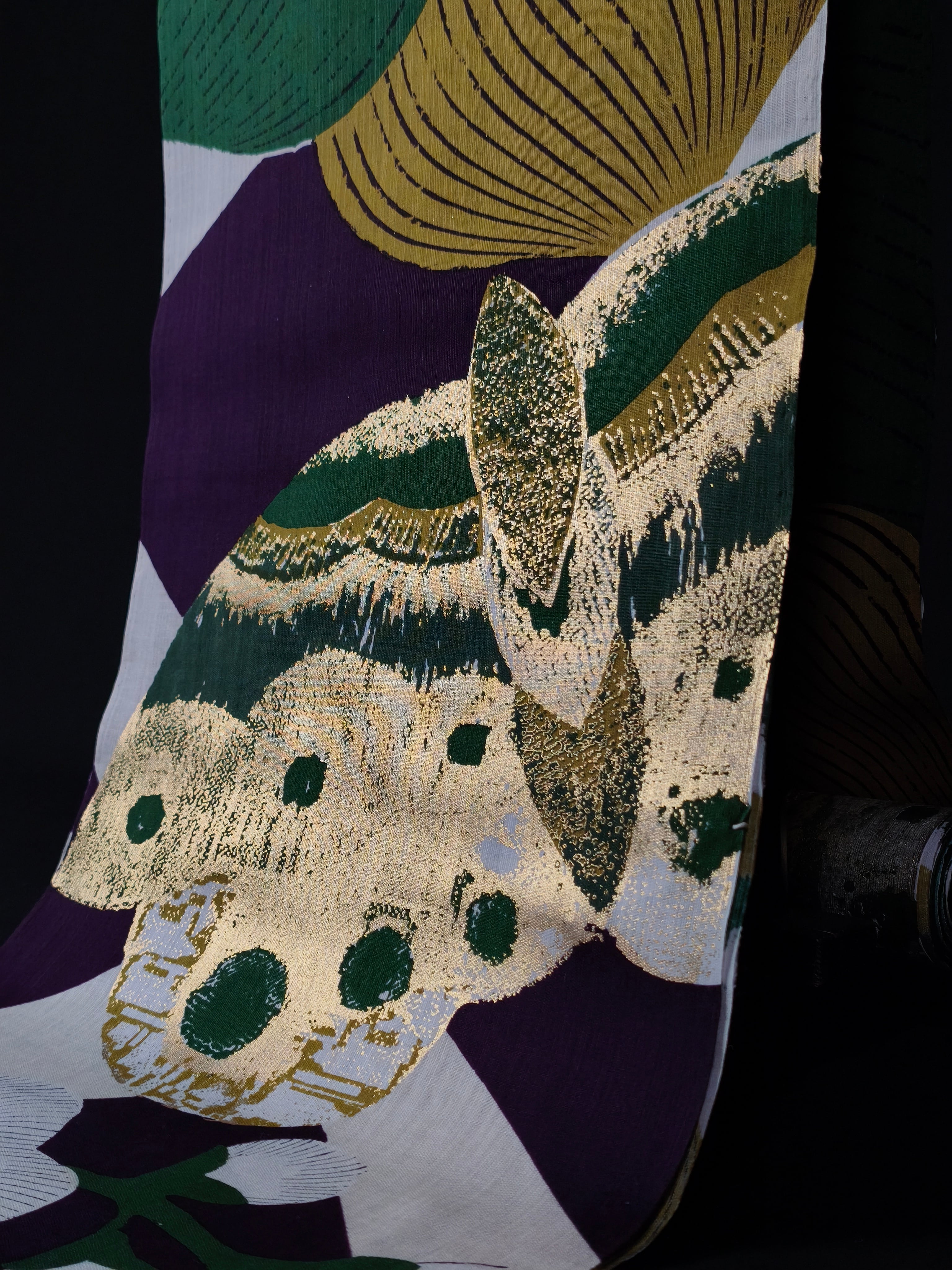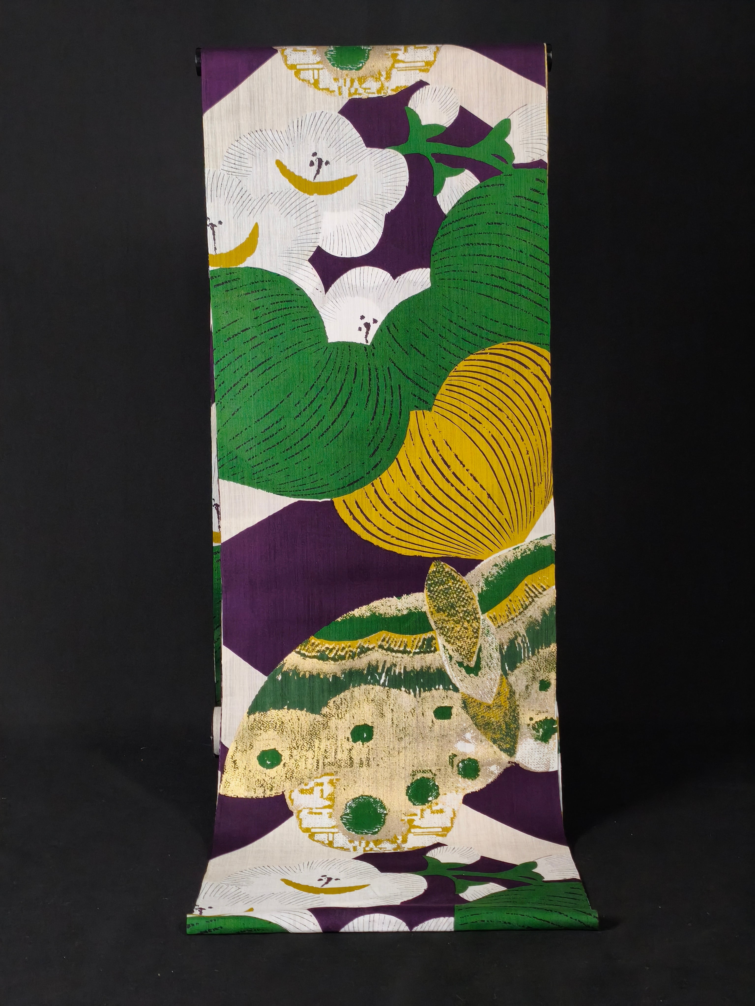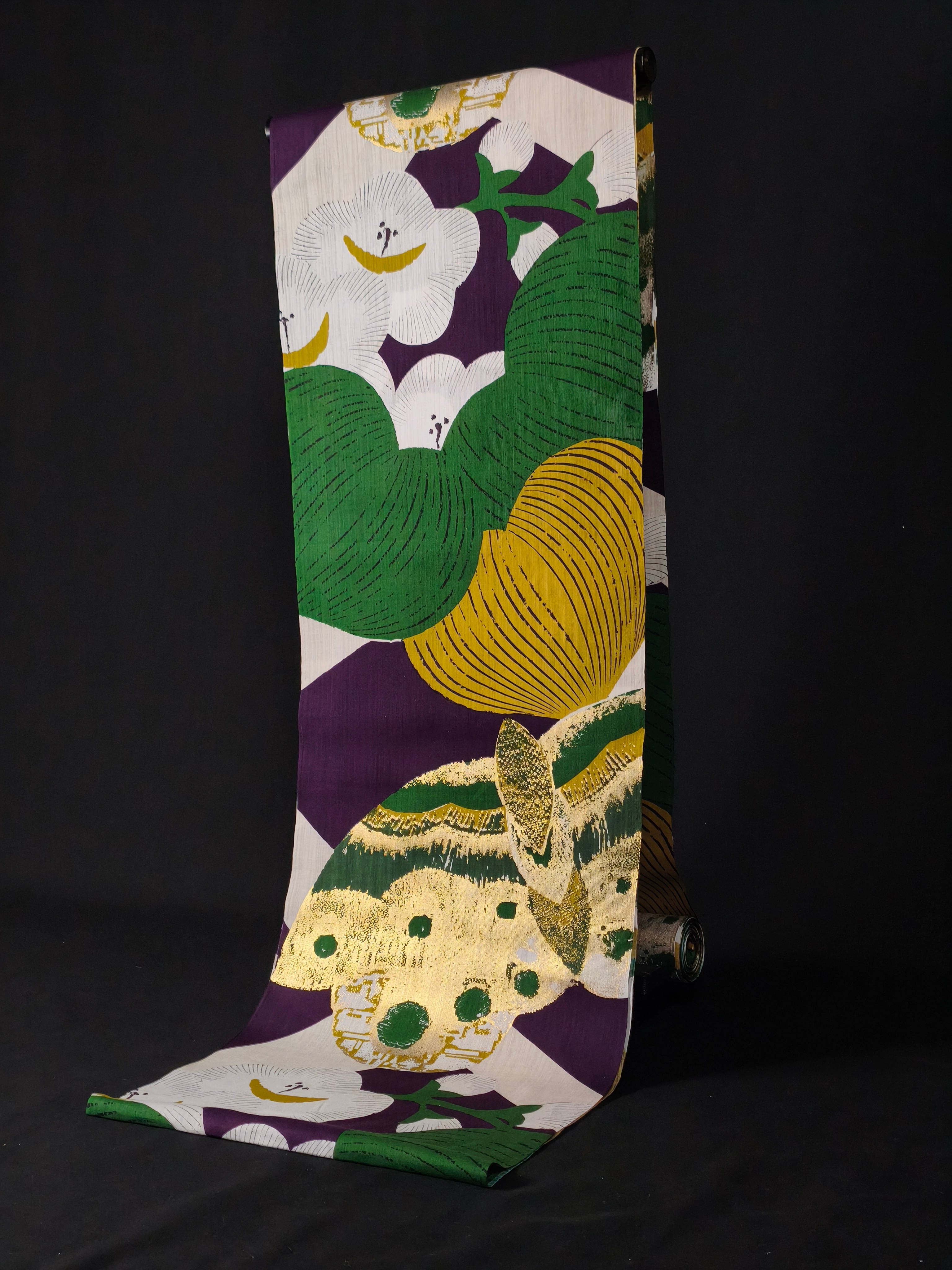 江戸時代の楊枝入れから取られた柄で、大胆な色使いで描かれた梅の花に金彩加工が施され、個性溢れる浴衣です。