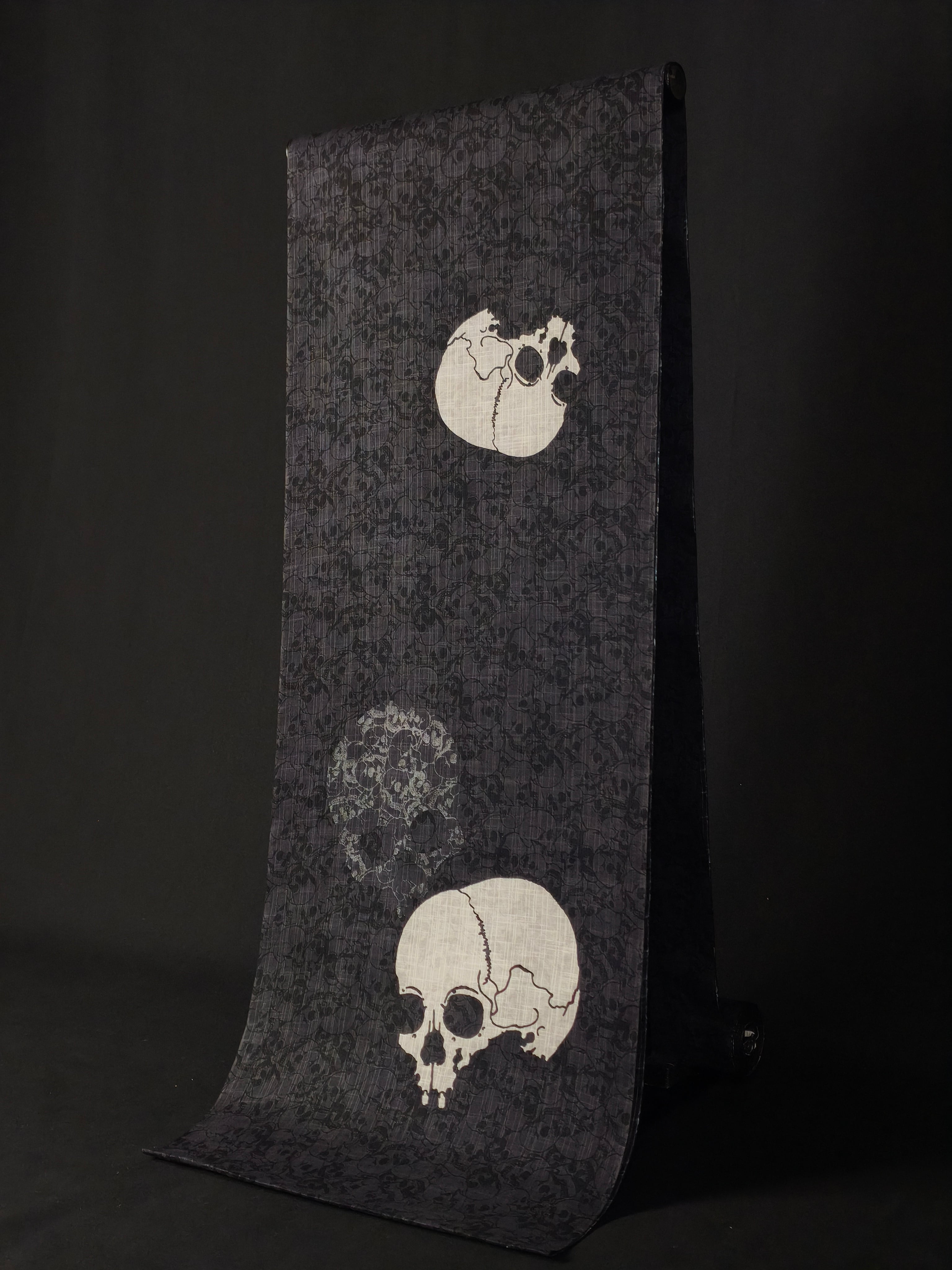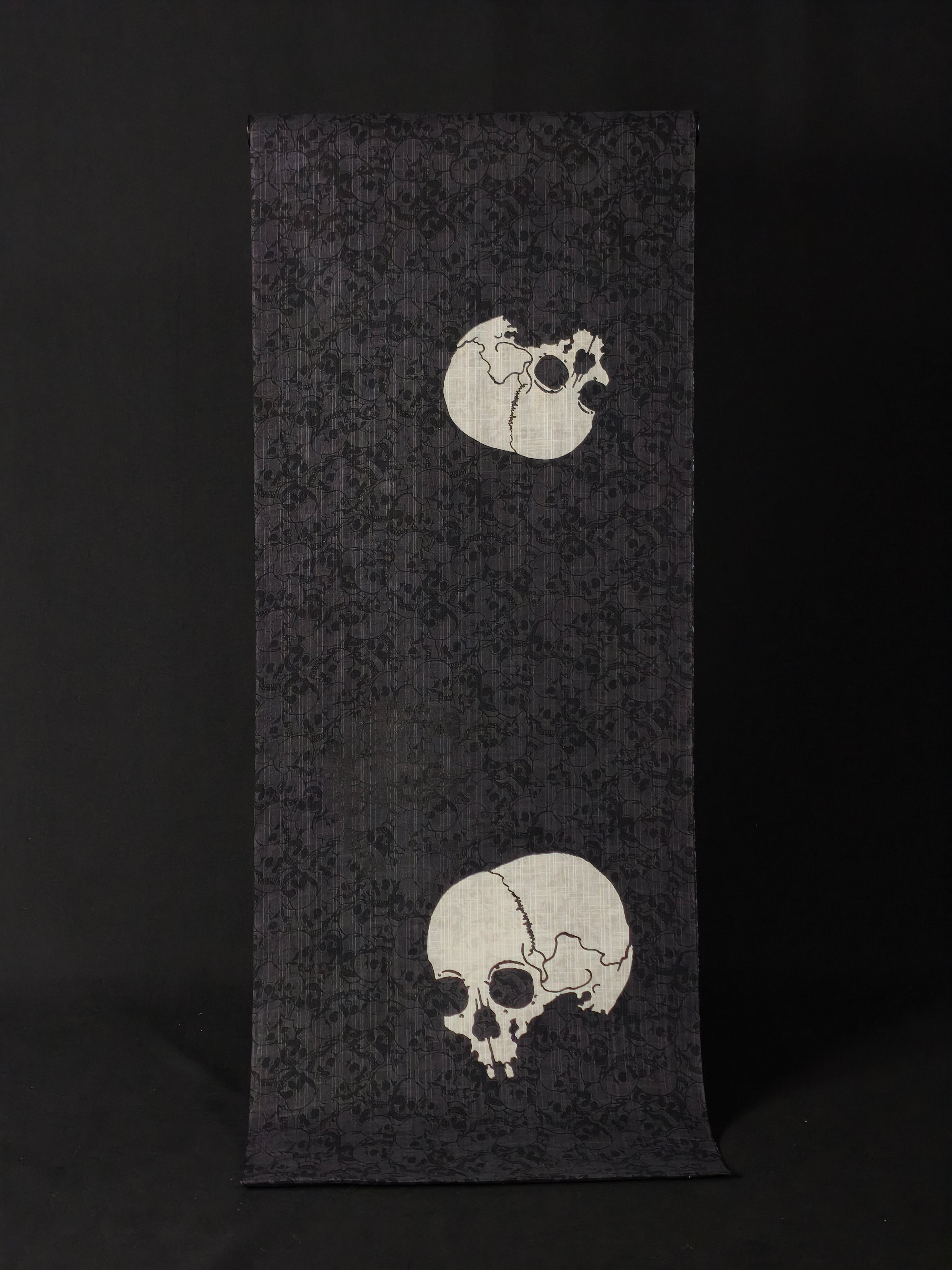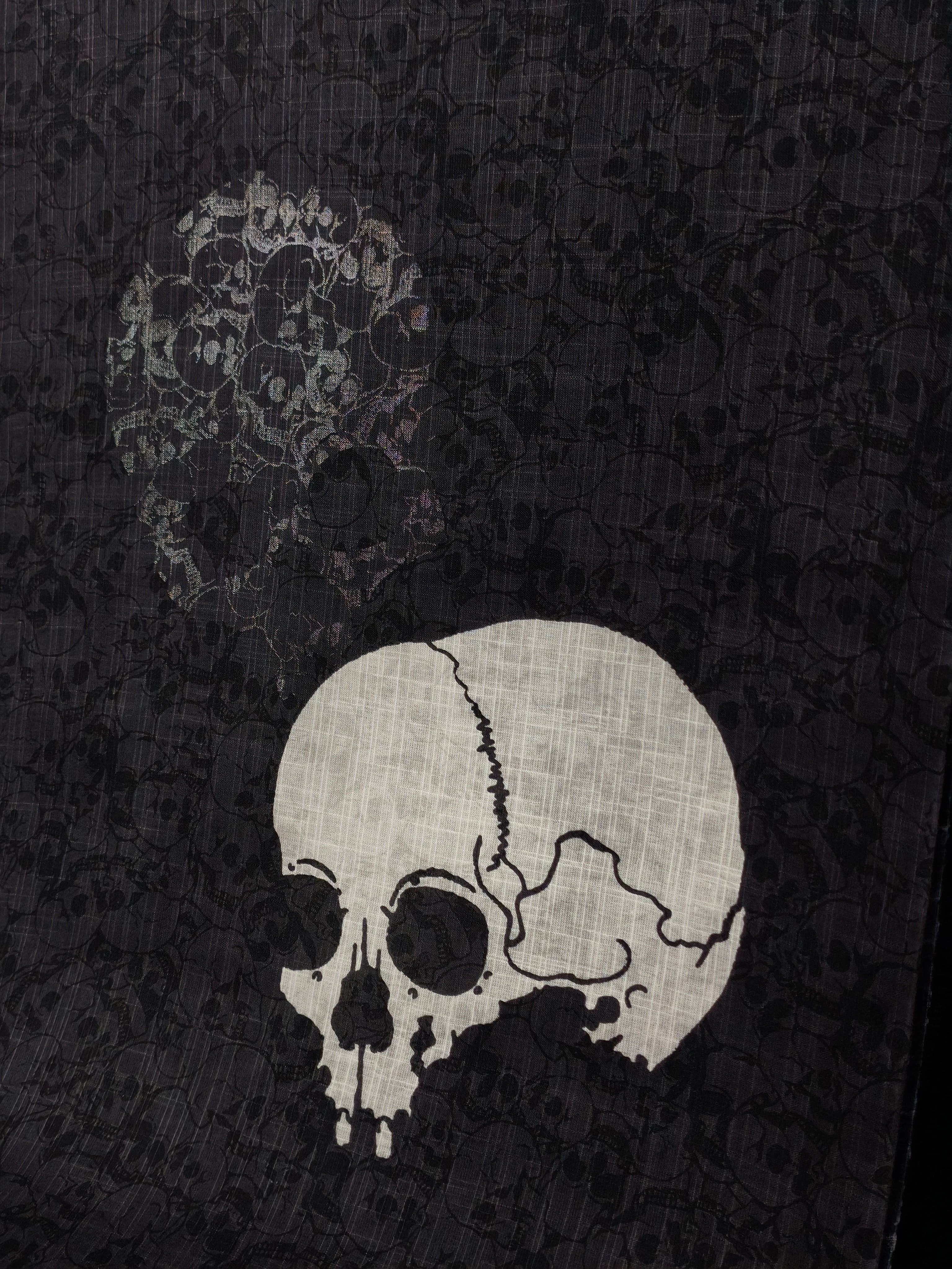 染は黒地に髑髏の柄を黒の濃淡で表した地に、白い髑髏の他、漆箔でも表現されていて、見る角度や光の当たり方によって柄が浮き上がります。※写真3枚目~6枚目参照