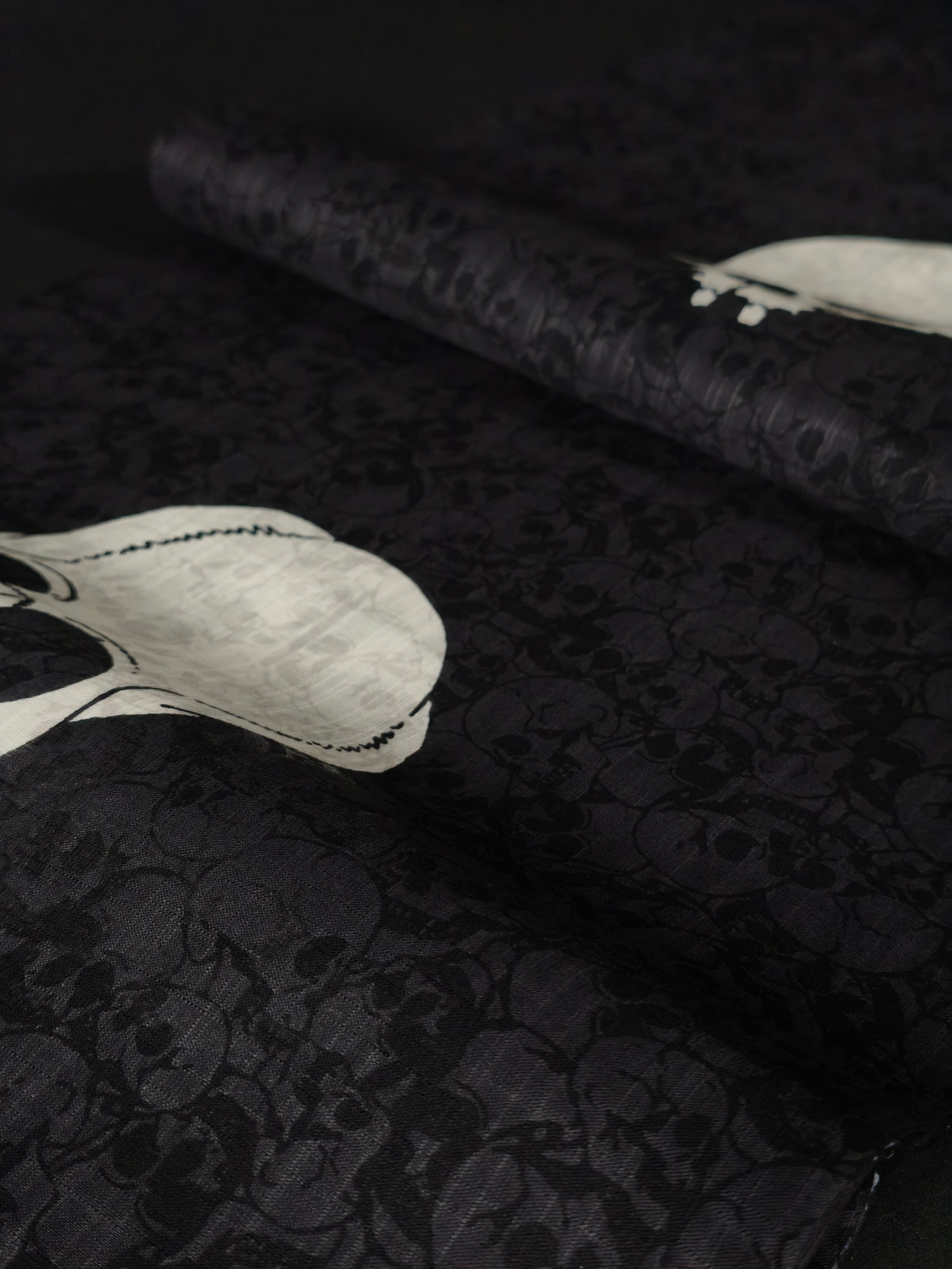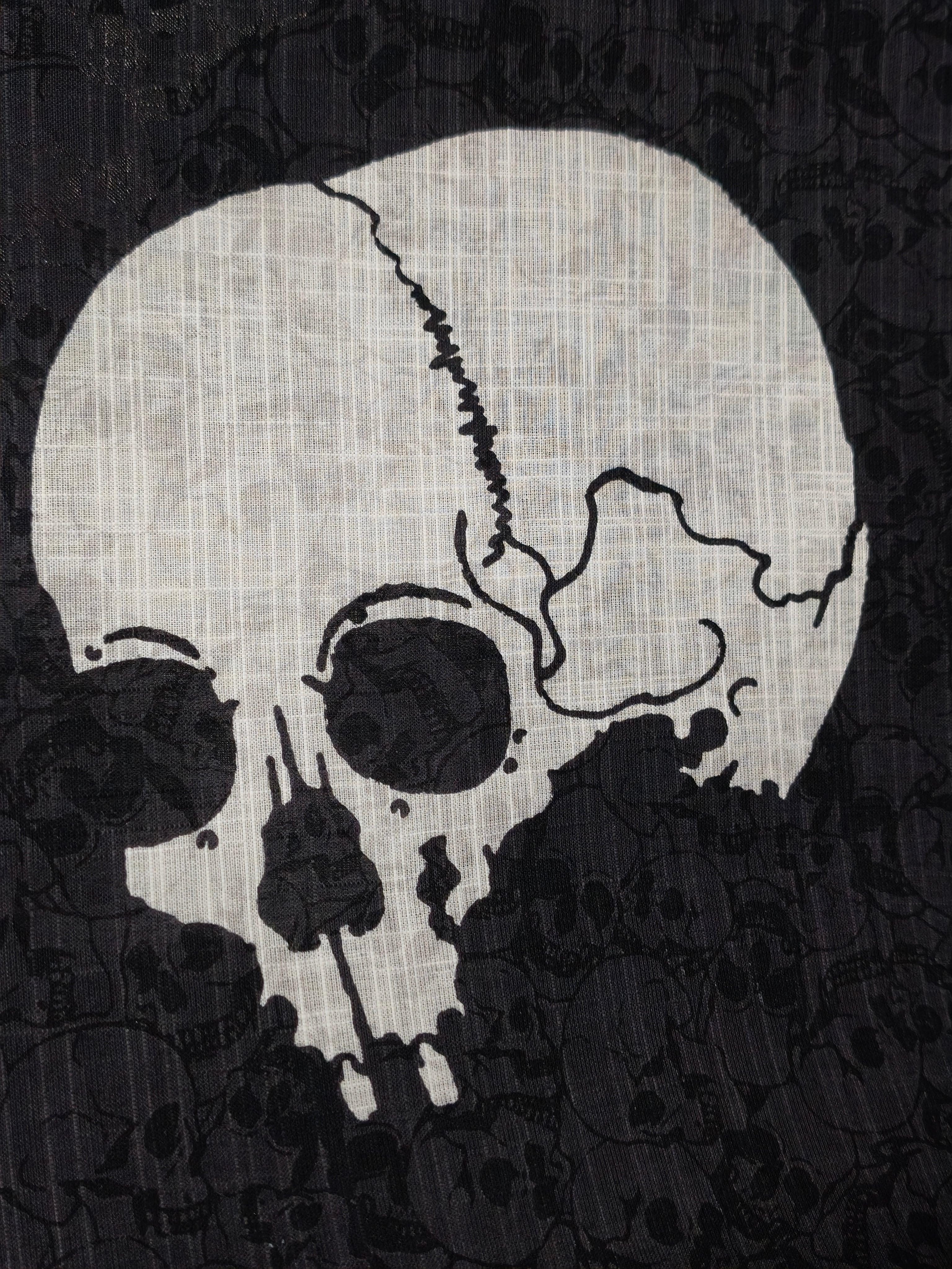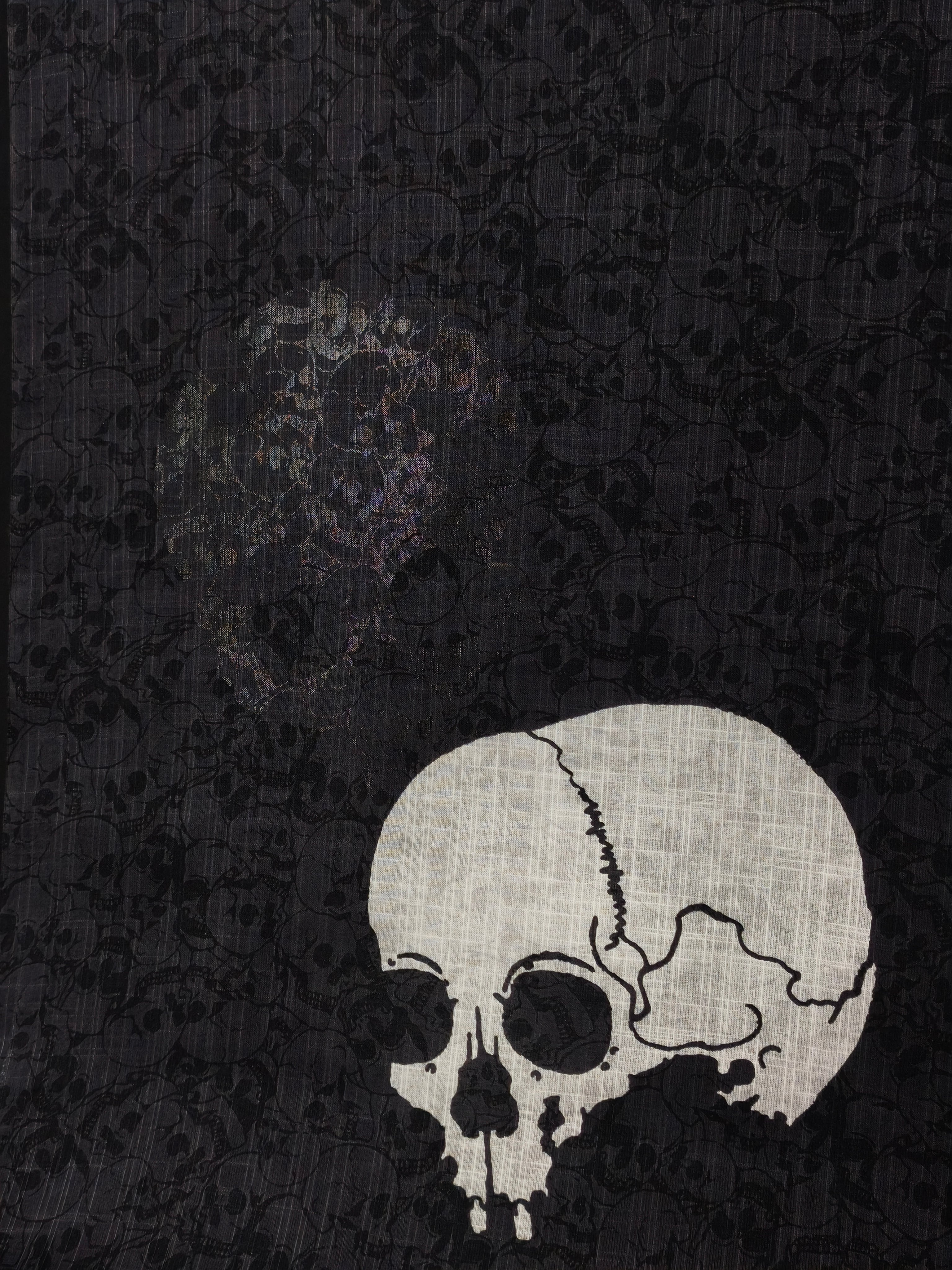 染は黒地に髑髏の柄を黒の濃淡で表した地に、白い髑髏の他、漆箔でも表現されていて、見る角度や光の当たり方によって柄が浮き上がります。※写真3枚目~6枚目参照