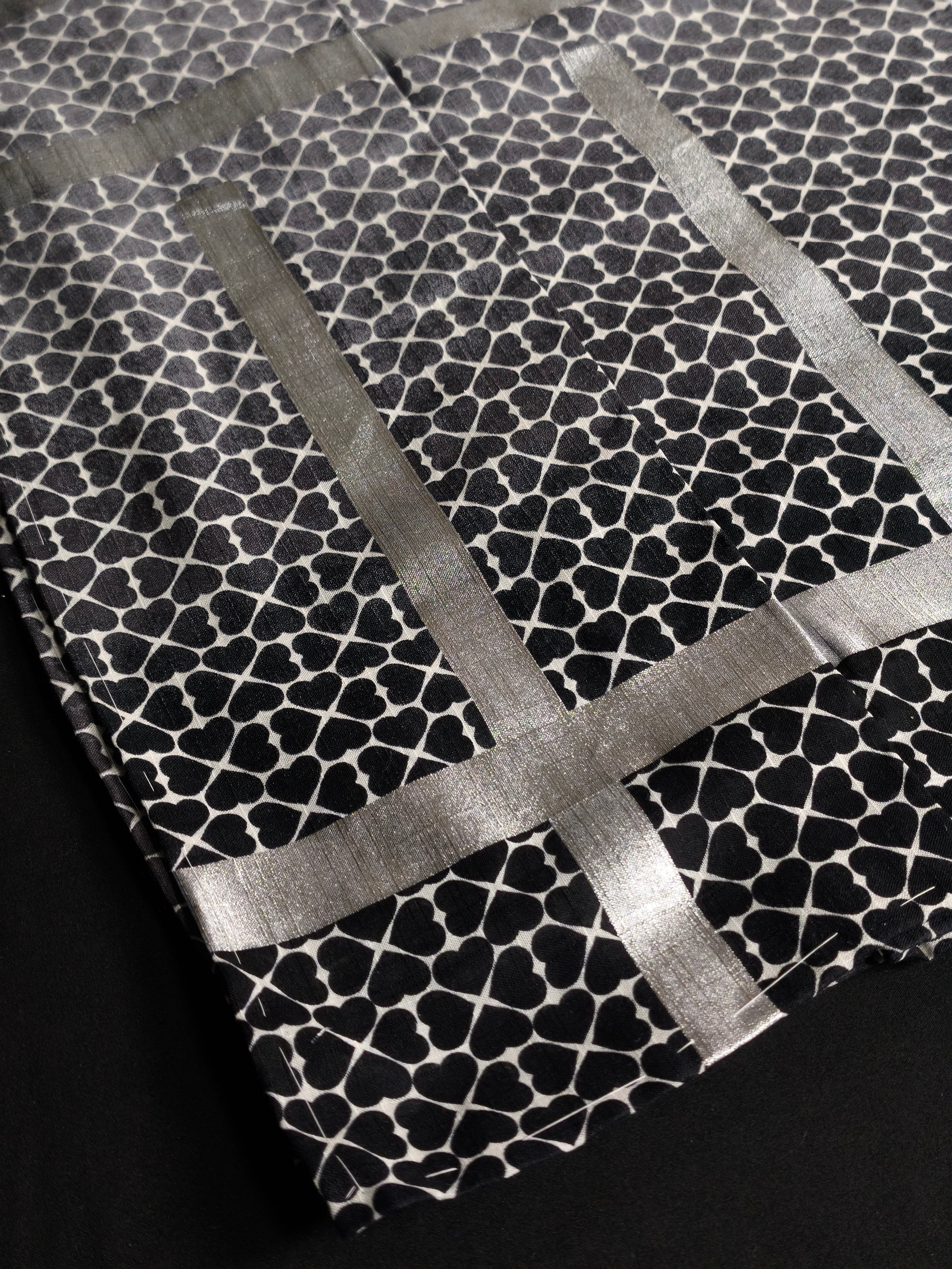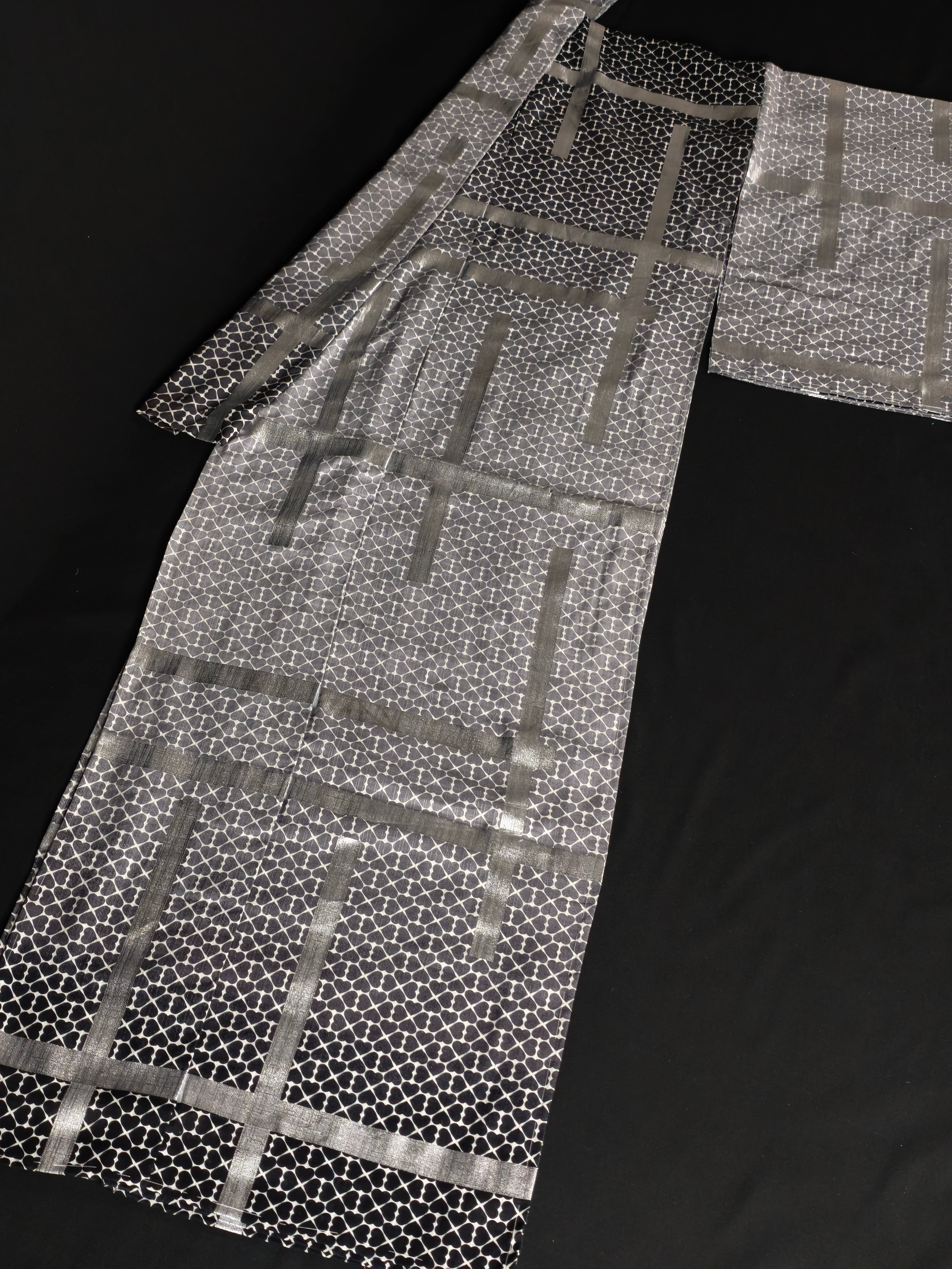 柄は黒~グレーで四葉のクローバーをボカシ状に配し「幸運」を表した上に、誉田屋源兵衛お得意の「破れ格子(やぶれごうし)」を銀箔で表現しています。